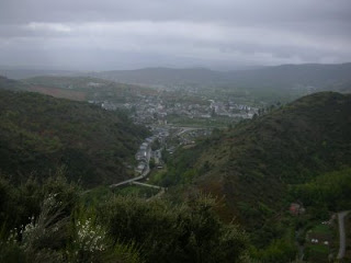 Third week of my excellent adventure is coming to close today and it is hard to believe that it has been that long. Just walking along one day at a time. As I was getting ready to leave this morning my thoughts were that I just about had enough of this, I want it to be over. This morning a light rain was falling but it was not cold. Cacabelos seems to be a dreary town in the middle of a wine growing region. Too small to be a town but too large to be a village. In the morning I walked though vineyards mainly until reaching the next town, Villafranca which is a beautiful town with a huge church towering over it. On leaving town, I took a longer route over the mountains to reach the next town. Being in the mountains again was fantastic. I seem to have the trail to myself with stunning scenery as I walked to the top. I felt light and the climbing was effortless. The rain was falling intermittently – I could hear cuckoo birds calling in the distance and even the sun came out briefly. Not sure if it was the Voltarin or the endorphins kicking in, or the Helen Reddy song “I am woman” going around in my head – or a combination of all – but I felt once again that I could just walk forever. Even as I came across a man with an axe not for one moment did it occur to me to be worried.