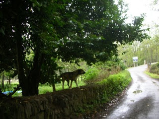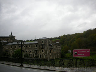 The rain in Spain falls mainly in Gallicia. It is the state through which the last 150 km of the Camino passes. It can rain for weeks apparently and today the rain came in a slow drizzle which let up a little but stayed around pretty much all day. Even though it was raining, it was not cold at all and was quite pleasant walking. I chose the walk to Sarria through Samos partly to see the Benedictine monastery there and partly to avoid walking along the highway. The monastery is huge and quite well preserved and the town would be nice to visit by car. The walking today was almost entirely through lush green countryside. The wet climate is evident by the ferns growing all along the path.