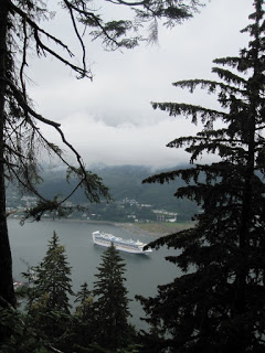 We walked the 8km to the hotel, then got the bus down town Juneau and walked around the deserted town. It was still early in the morning even though it felt like mid-day. Cruise ships were circling the harbour ready to dock so we headed up the trail to the peak of Mt Roberts which towers over Juneau.