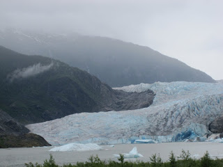 Back down-town the streets were filled with people off the cruise-ships. We go the local bus out of town towards Mendenhall Glacier and walked the 3km from the bust stop to get to the lake below the glacier.