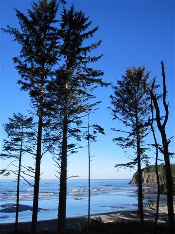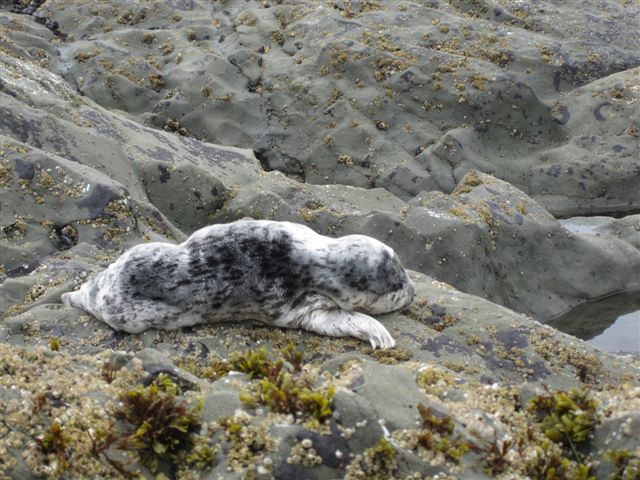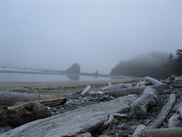 The air was so damp that it felt like a light rain was touching everything. We walked at low tide in the mist and it was quite surreal especially when we chanced upon a deer and were further surprised to see its young and another one following it out on the rock platform. As soon as they saw us they pranced off, disappearing into the mist. As the tide began to turn we walked back to our camp coming across a seal pup snoring away protected from view from the shoreline. Our cup of happiness was full and we went back to the tent to warm up, read a book and listen to the roar of the ocean. Happily the next morning the mist had lifted, changing the look of the landscape yet again.  A magical few days and we had only touched a tiny strip of the vast Olympic National Park.