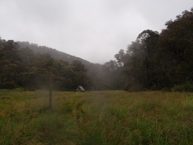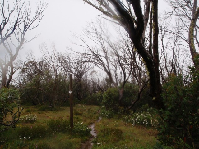 It was impossible to run as my legs were being swept from under me and I was constantly being blown sideways off the path. The rain cut across my face like little razor blades which made my already damaged lips sting like crazy. I knew that just had to outrun the high plain and that conditions would change after I reached pole 333 where the alpine trail veers to the south. While still exposed to the wind, at least it would be coming from a different direction providing some respite. Reaching pole 333 was such a relief and I knew that the route eventfully drops down to Cobungra Gap. At no stage did I have thoughts of turning back by now I was committed to getting to Mt Hotham. Once I got amongst the tress it was almost ‘pleasant’ as long as I did not focus on the wind whipping through the trees above me. Reaching Dibbin Hut was boost and what a beautiful spot this would be on a good day.