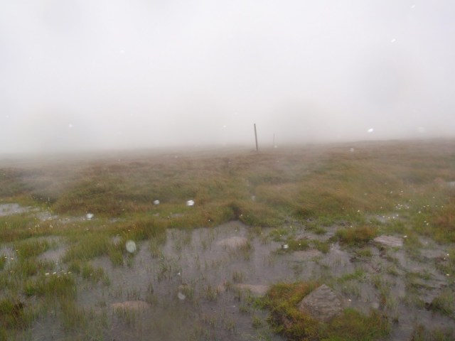 I got to Omeo Rd and thought it was not too bad despite the rain, fog and not being able to see beyond 2 poles ahead. As long as I can see the poles and I could keep moving it would be OK. And besides I had expected runners to be coming past me long before I reached Mt Hotham. As I got further along the high plain the wind got stronger and gustier and it was coming head-on. At one stage I thought I may have to hold onto the pole or I would be blown away.