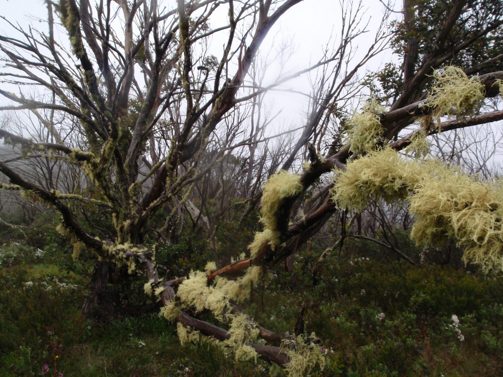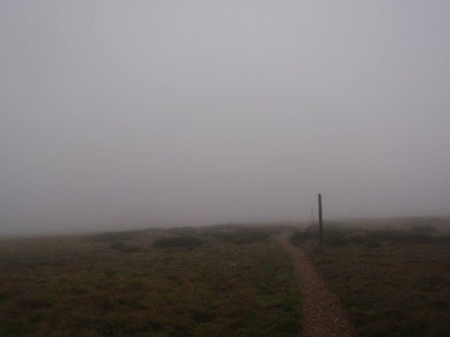 The roads were deserted and a heavy fog clung close to the ground. Rain and wind intensified as I got higher towards the plateau. Thoughts of pulling the pin and going back to the house had crossed my mind but since I was on my way I thought just get to Langfords Gap and then decide. There was one other car in the windswept desolate carpark when I arrived at Langfords Gap around 7.30am. I guessed this to be the radio operator arrived to set up. Strong gusts of wind rocked the car. I sat in the car for 15 minutes debating he wisdom of going out on my own in these conditions. Before I could talk myself out of it I took a swig from my can of courage and got out, reasoning that I can run to Omeo Rd, about 5kms ahead, and if it is still bad then I can turn around. The Alpine trail to Omeo Road is a 4WD track and as I realised later relatively protected from the wind.