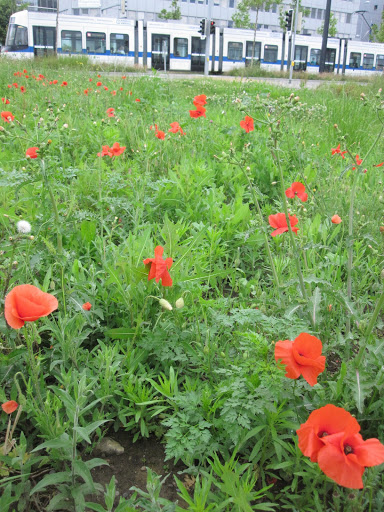 A tram line into town passes in front of the hotel but we decided to walk despite the conditions. After such a long time cooped up in one place it felt great to feel the wind on your face, smell the fresh air and just to move freely. The wild flower borders along the tram line looked fabulous even on such a dull grey day.