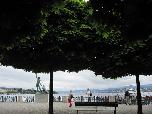 | A view of the Zurichsee from under the tightly clipped maple trees on the Quai Brucke. |