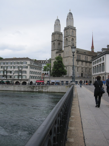 | A view of the twin towers of the Grossmunster church from the Munsterbrucke. |