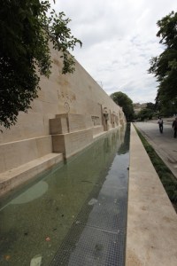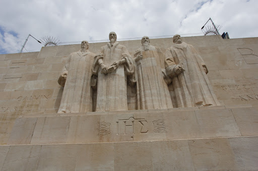 One of the park walls is formed by an enoromous stone carving know as the Reformation wall which depicts the regions religious founders Beze, Calvin, Farel and Knox .