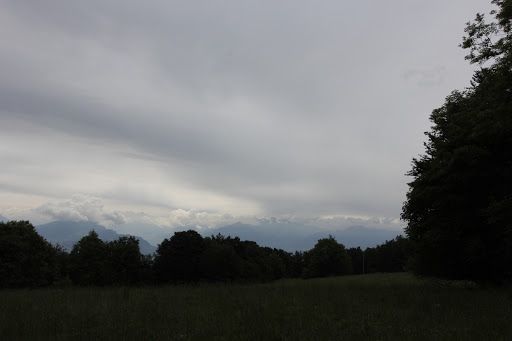 We walked along a trail at the top of the mountain to the sound of sparrows chirping in the forest. We were rewarded with almost clear skies and views out towards Mt Blanc in France.