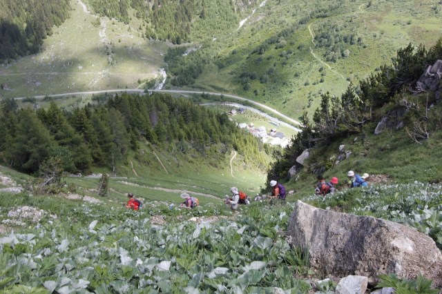 We seem to climb forever getting closer to the snow cover. Once we got out above the tree cover, the open meadows covered in alpine flowers were truly breathtaking. Surprised to see low azalea shrubs covering the north facing slopes. We stopped for lunch with glorious views up the valley.