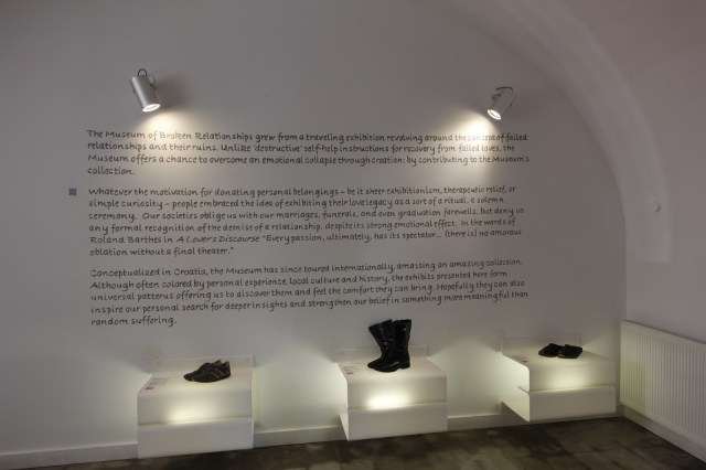 The highlight of the day though or maybe highlights was the visit to the History Museum with an exhibition of the artifacts recovered from a 16th Century shipwreck in the Adriatic. Amazing recovery of so many items that have survived more that 400 years under the sea including a chest that contained a roll of damask fabric and several items of clothing. Outstanding exhibition, amazing artifacts all housed in an interesting Baroque period building for $2 entry fee and we were the only ones there. Our most intriguing visit for the day though was to to the Museum of Broken Relationships.Simply wonderful trawl through artifacts of relationships gone wrong.