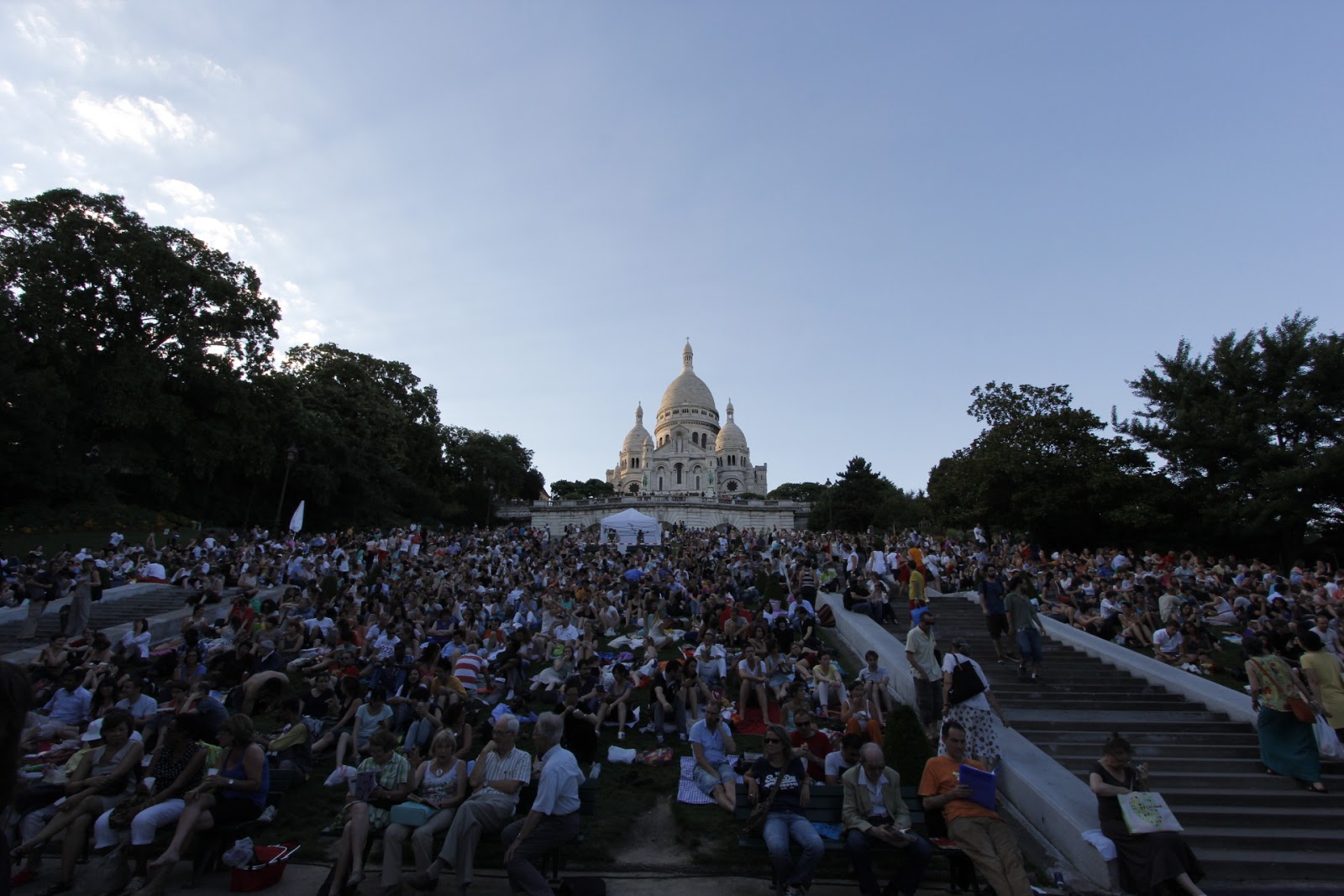 | Crowd gathered for a free outdoor cinema screening of a Woody Allen film – A Minute in Paris. |