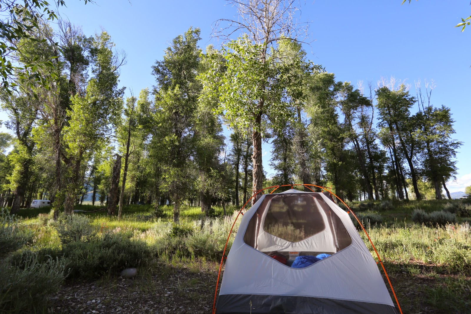 As we left Rock Spring, the flatness of the landscape soon gave way to distant snow covered mountain peaks. By lunchtime we made it to Jackson Hole which is the closest town to the park. We made it to the the Grand Tetons NP by late afternoon by which time most of the campsites were full. We ended up staying at the lovely Grande Verte which was near the southern entrance to the park.