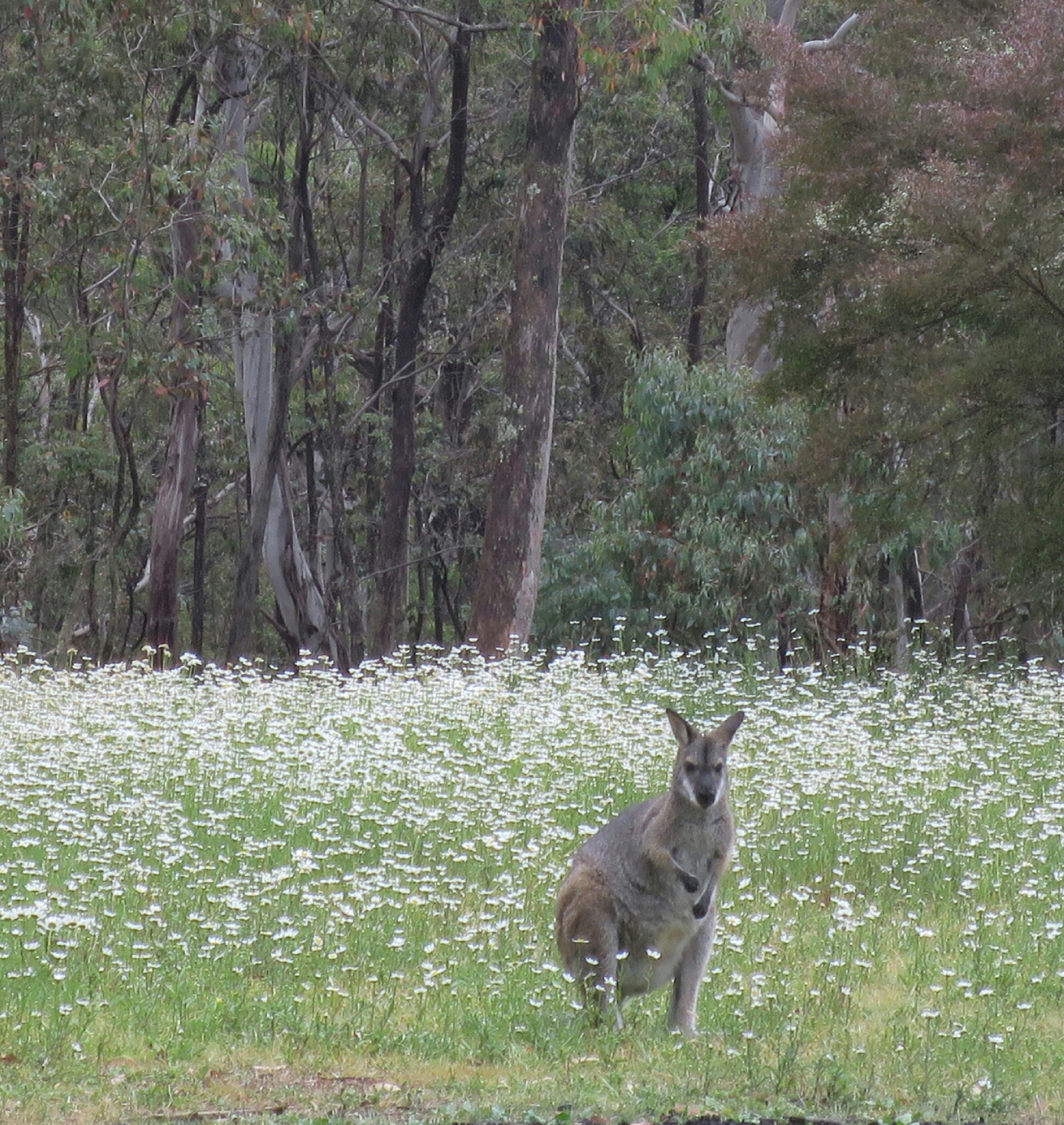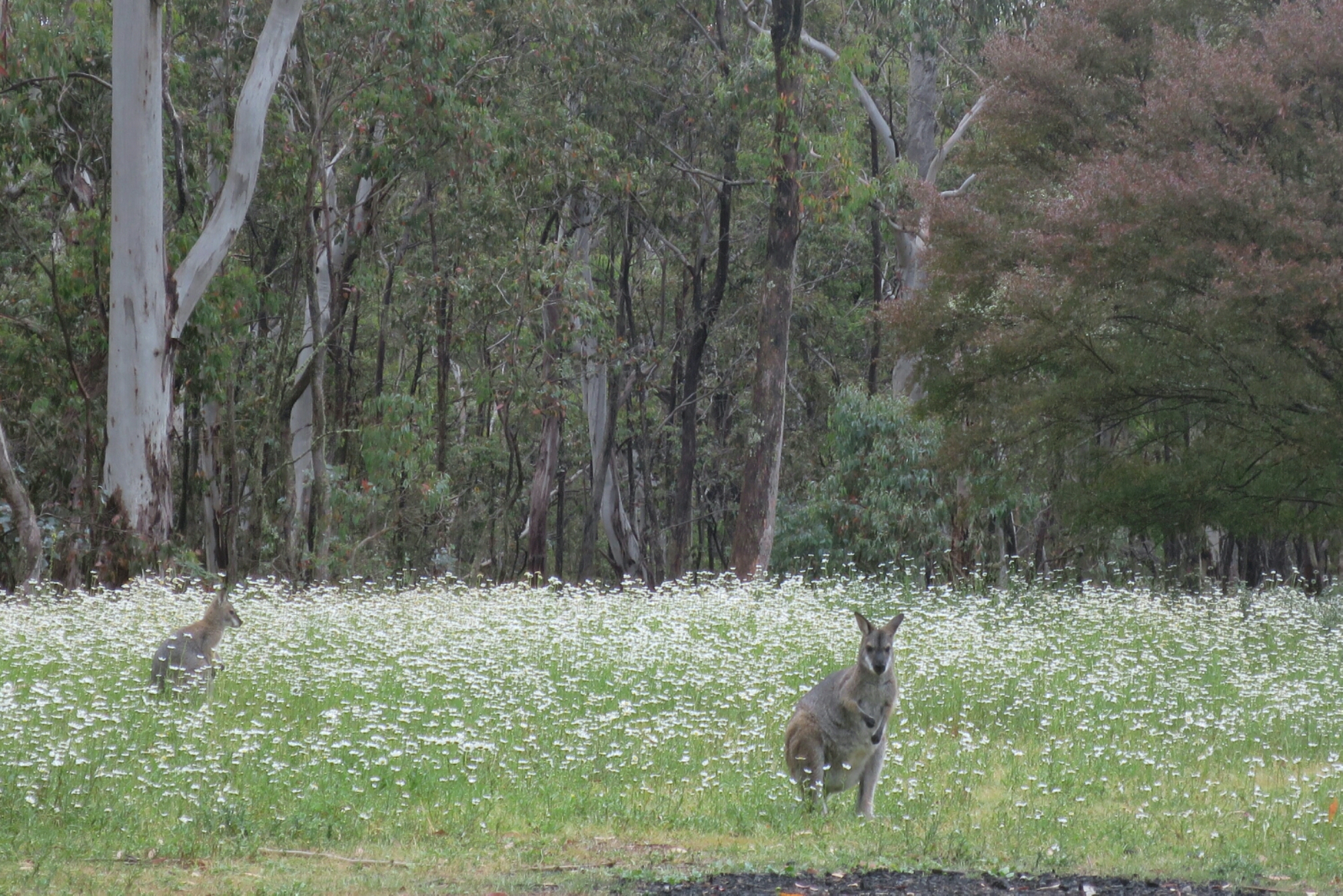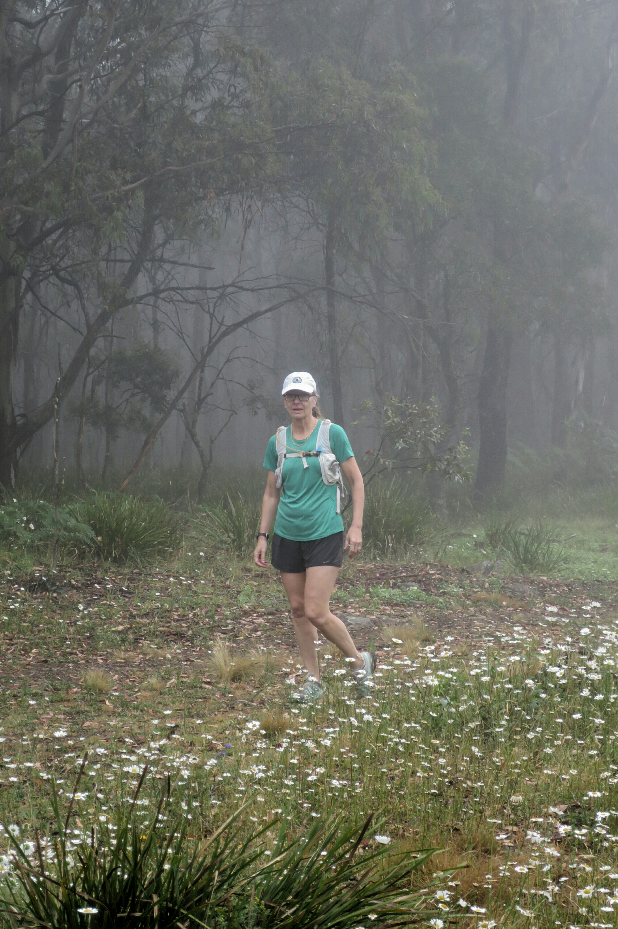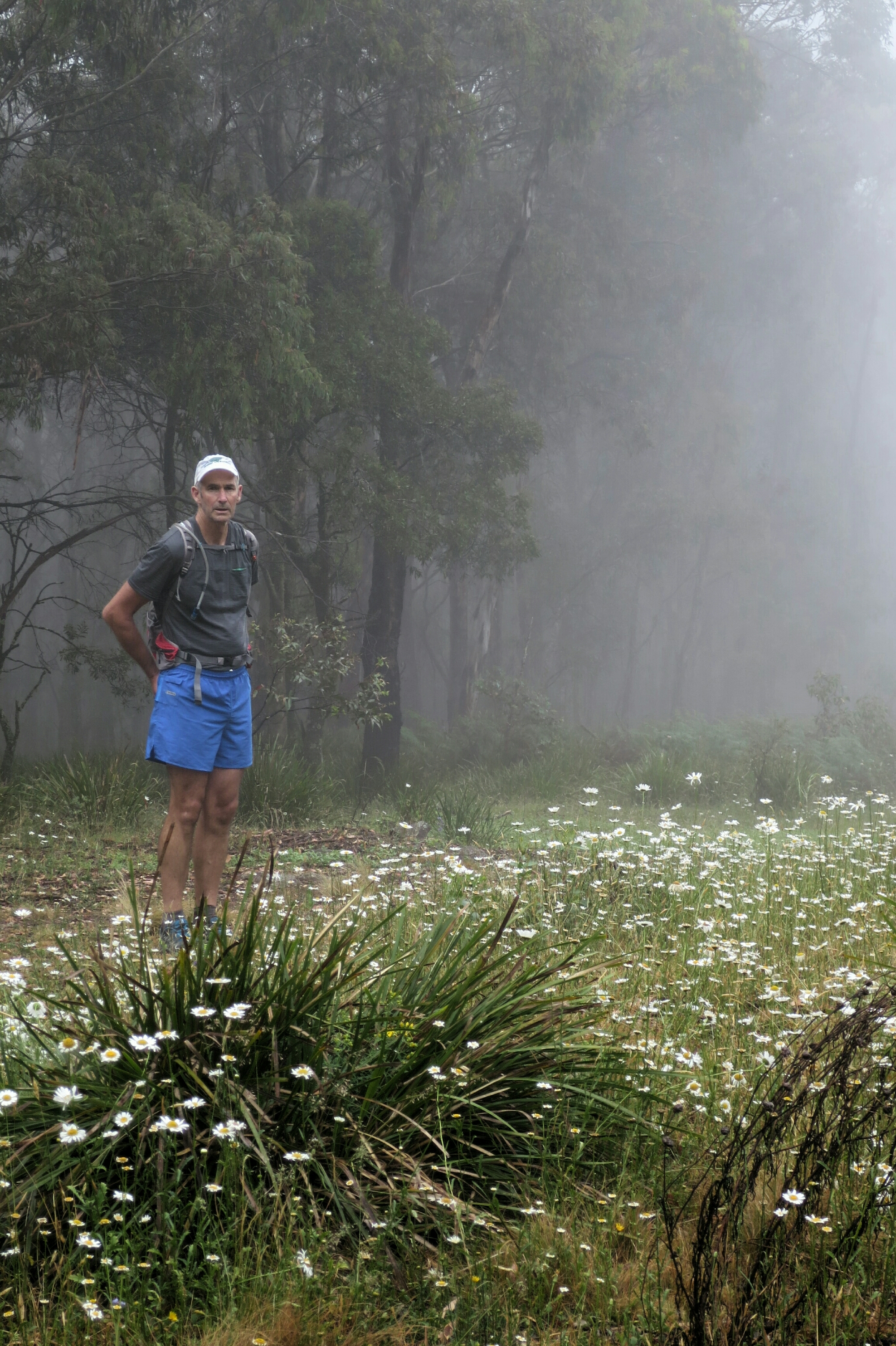 We were surprised by how much easier the walking was when the temperature was cooler. We made the climb in just a bit over and hour and it felt so much easier compared to yesterday afternoons effort up the Minimini Saddle. By the time we started on the Black Range the sun had come out and with it the flies. The Black Range is a 9km stretch of gradual uphill undulations. When we had run through here in the past, it tended to have a hypnotic effect where time seems to stand still and you start to feel like it will never end. It has broken many a runners hopes of a good race. We found that hiking it was pretty much the same. You just have to put you head down and not think too far ahead. You just got to get it done and it does eventually end. It is always exhilarating to hit the pine forest and realise the the Range is behind you. We made it back to the Black Range campground where we started on Monday in just a bit over 3hrs for 13 kms. Here we swapped our hiking backs for day packs and headed off for a 20km return trip to Jenolan Caves. The vegetation on this stretch was surprising lush with deep fern covered gullies and moss covered bark on the trees. Not long into the walk the clouds started to gather, the flies disappeared. Before too long the light drizzle gave way to a steady shower and by the time we reached Caves House, a heavy downpour. We waited for the rain to ease before setting off on the retun leg back to Black Range campground. On our return trip the valley was covered in mist, which made it look so beautiful and so serene. The rain seemed to clear the air and it was so quite. It felt like we were the only ones out on the trail. Fog covered everything which added to the beauty and the silence. The buzz of flies around our heads was a distant memory by now. The return trip seem to take no time at all. We were greeted on our retun by sunshine and a mob of kangaroos feasting in a field of daisies. Such a beautiful sight. A grand way to end a 90km, three day hike in our backyard.