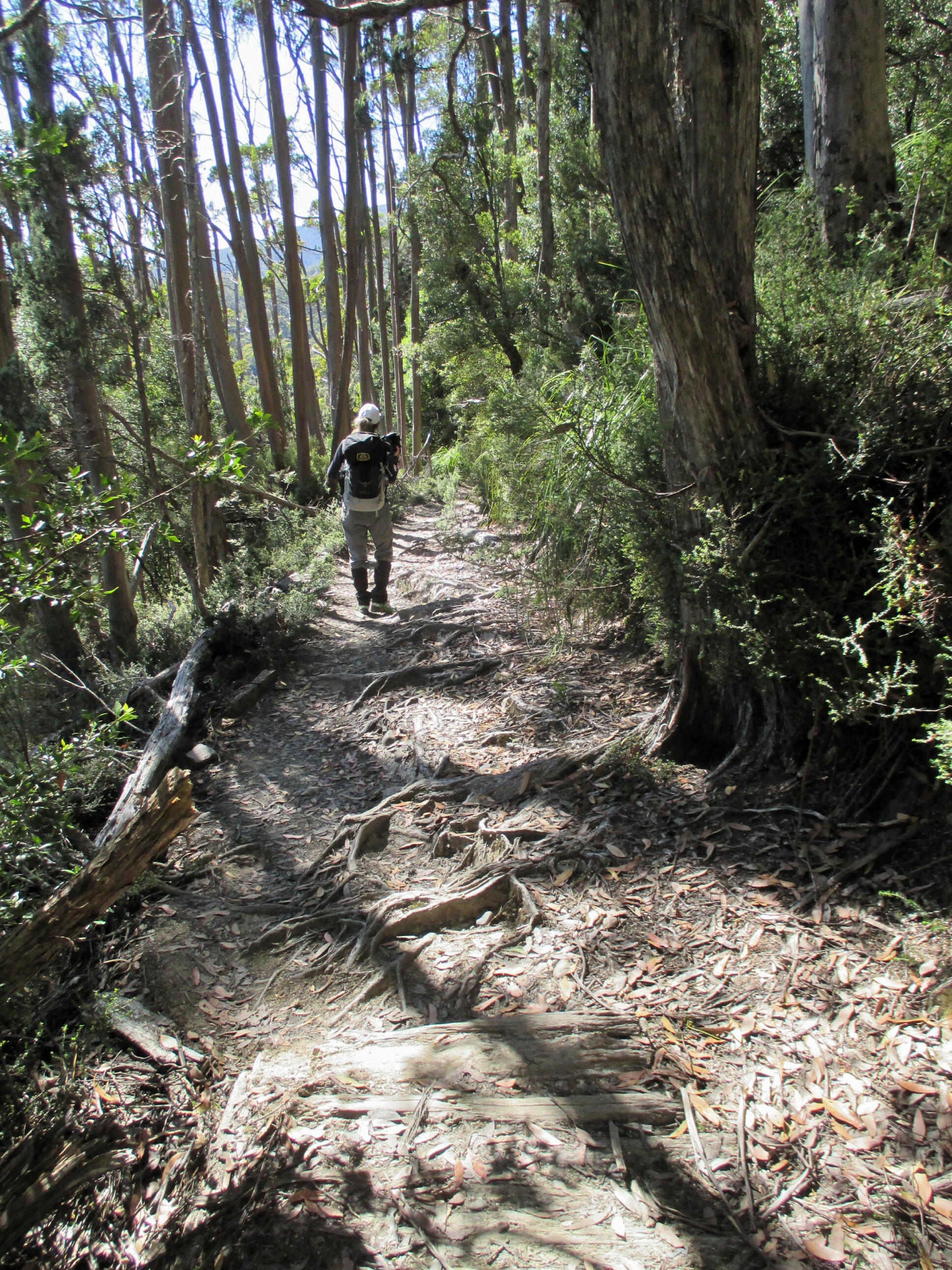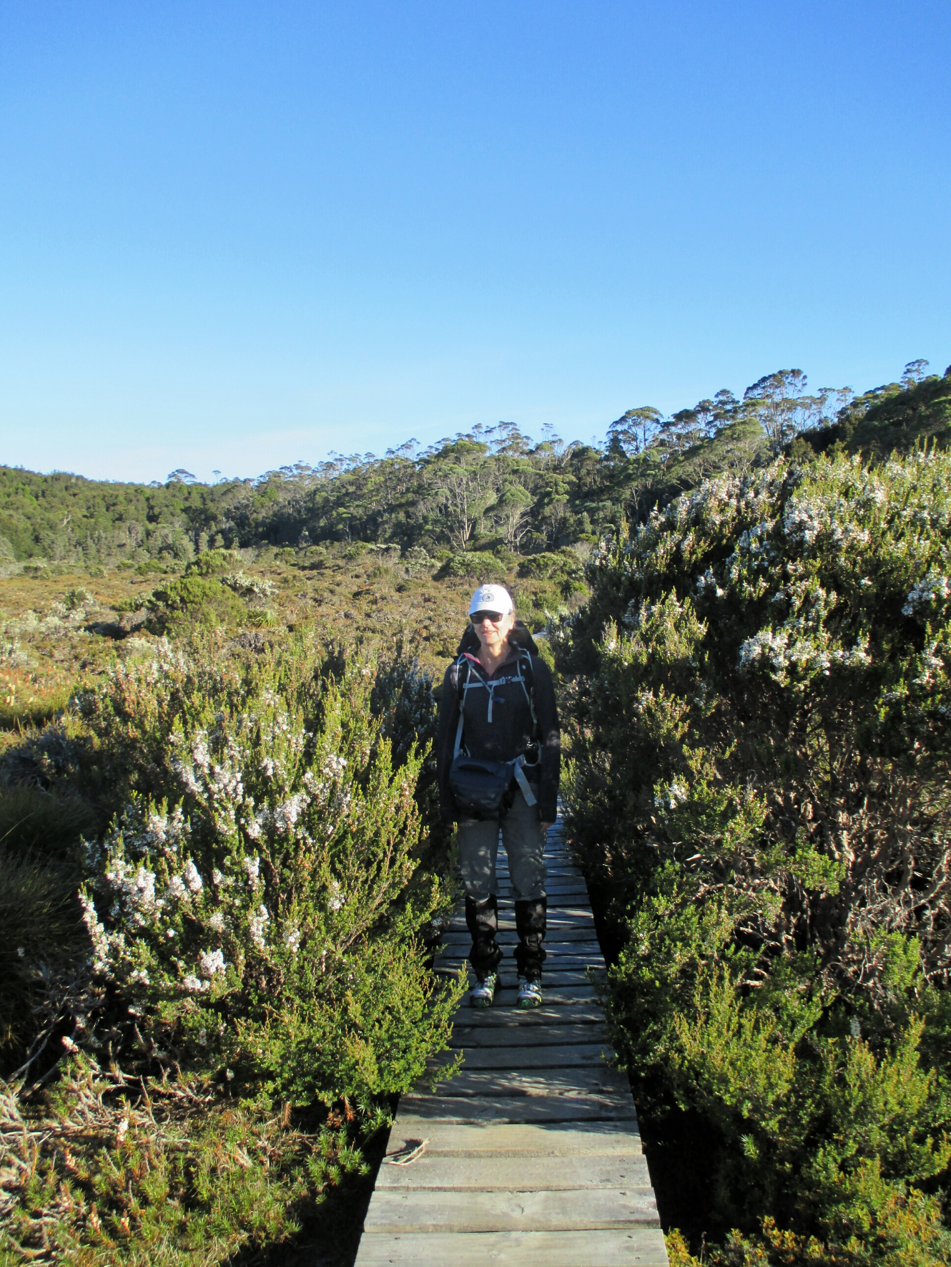 Another absolutely stunning day with clear blue sky and temperature in the mid 20’s. We both managed the walk well, finishing before midday. We had lunch, put up our tent and pottered about, resting a bit before heading back on the trail to visit Old Pelion Hut and a swim in a very refreshing waterhole. I never imagined that I would ever be swimming in cold Tasmania let alone on the Overland Track. It is notorious for miserable weather most of the time.