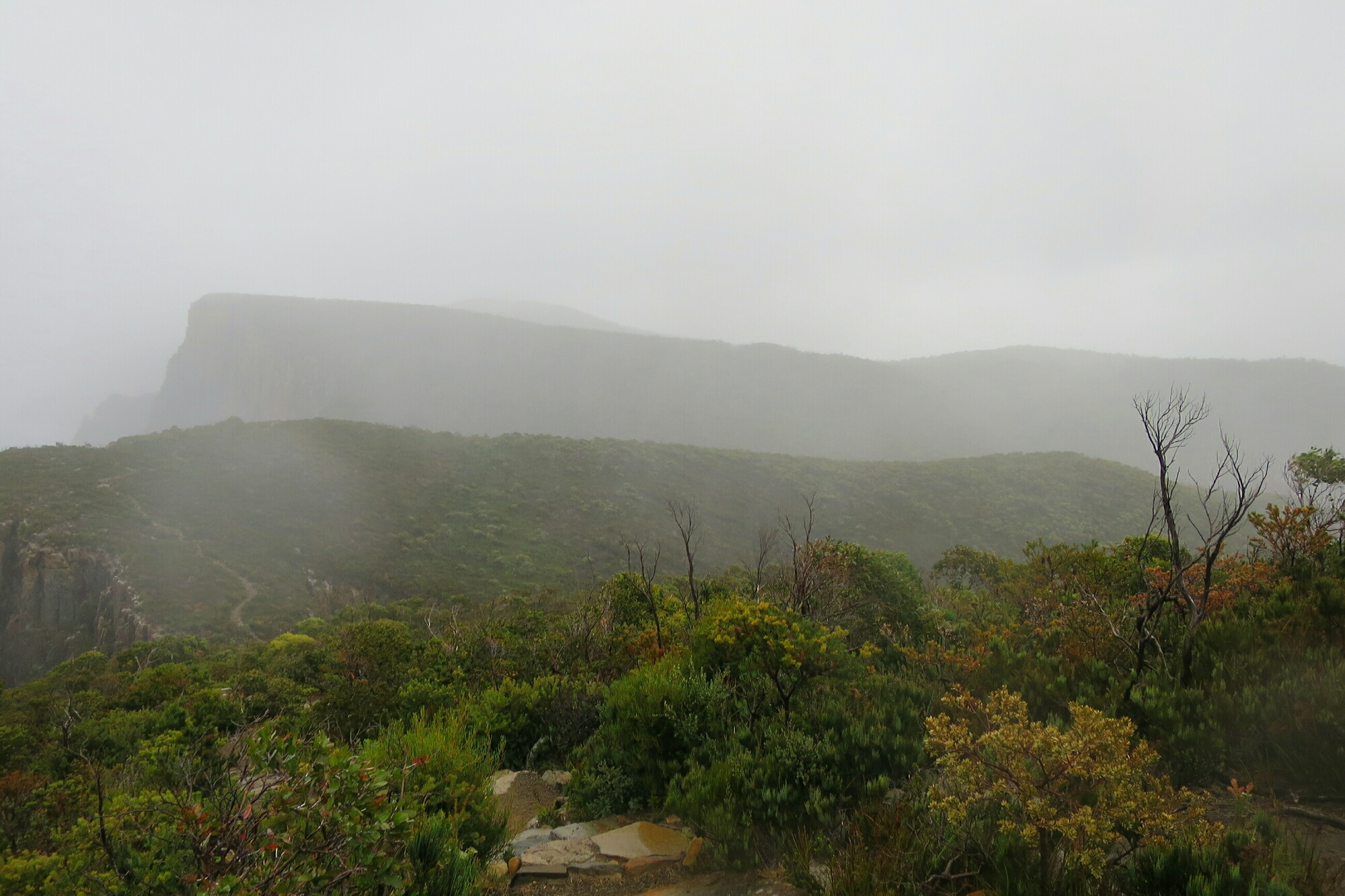 I left Hammer behind and ran out to the Cape just to get warm and get out of the sweeping wind and rain. Reaching the Cape offered some protection from the wind and great views back towards Cape Pillar…although it was all a bit misted. It was a quick sprint back to the camp. The rain had passed by the time we returned.