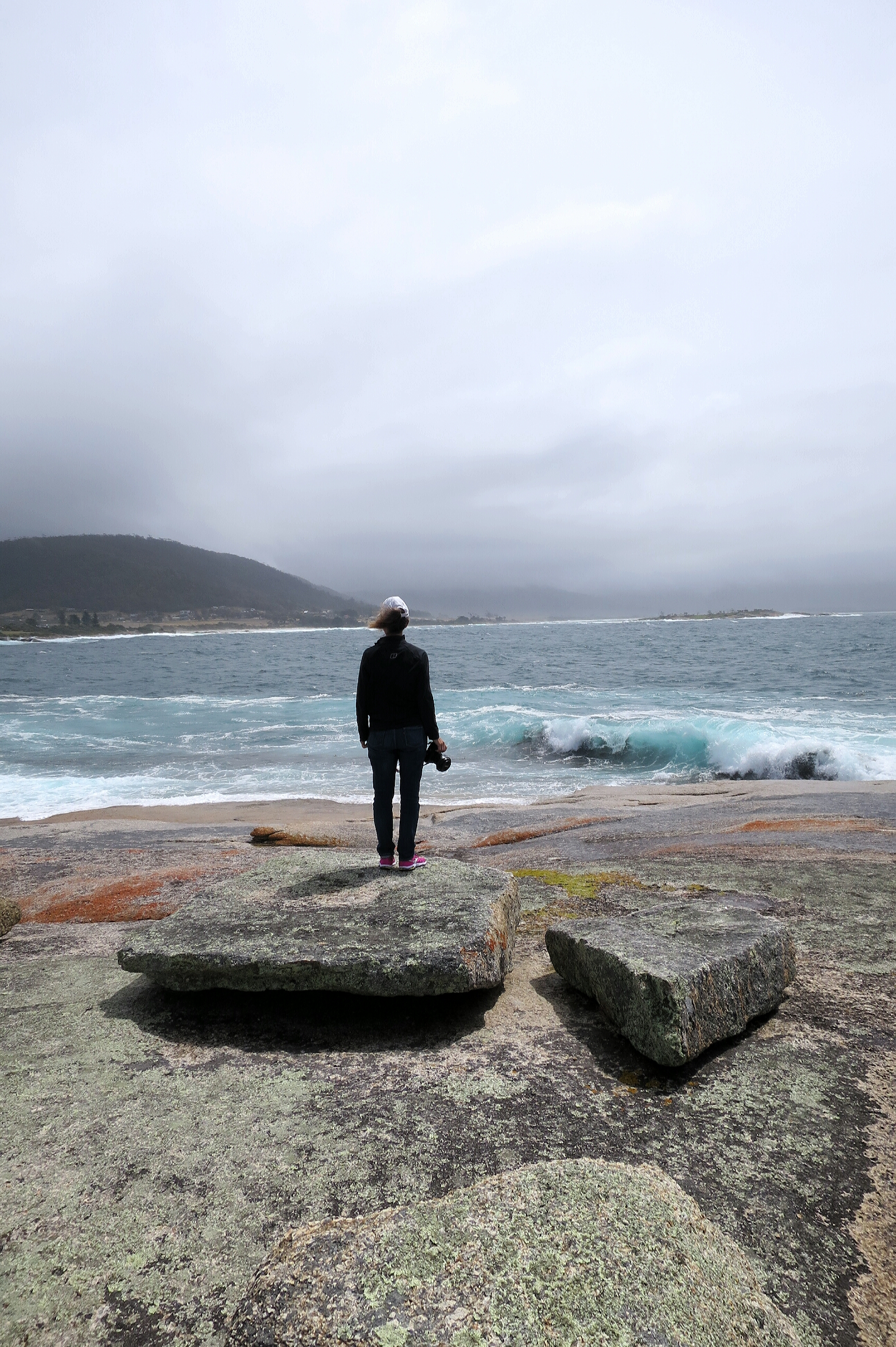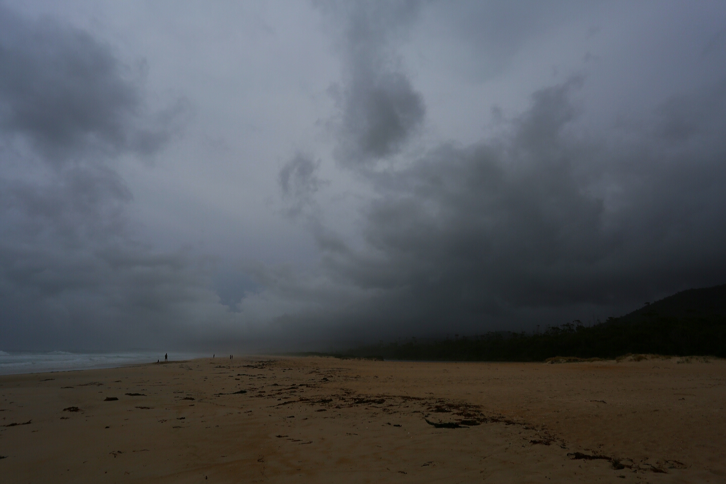 After a brief lunch in Bicheno we stopped to camp at Lagoon Beach Nature Reserve to the north. The rain had cleared we went for a walk on the beach which stretched out a long way into the misty distance. It was beautiful, deserted and desolate. The salty sea air was so dense it tasted like dashi stock. The grey clouds in the distance looked threatening. And sure enough by the time we got back to camp and had dinner, the sky has opened up again.