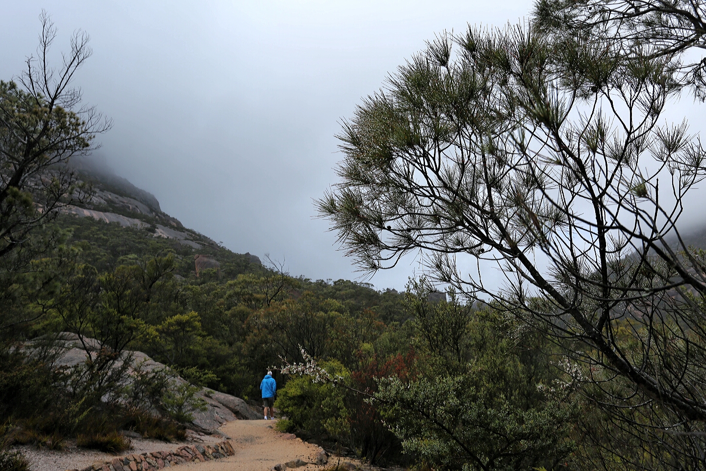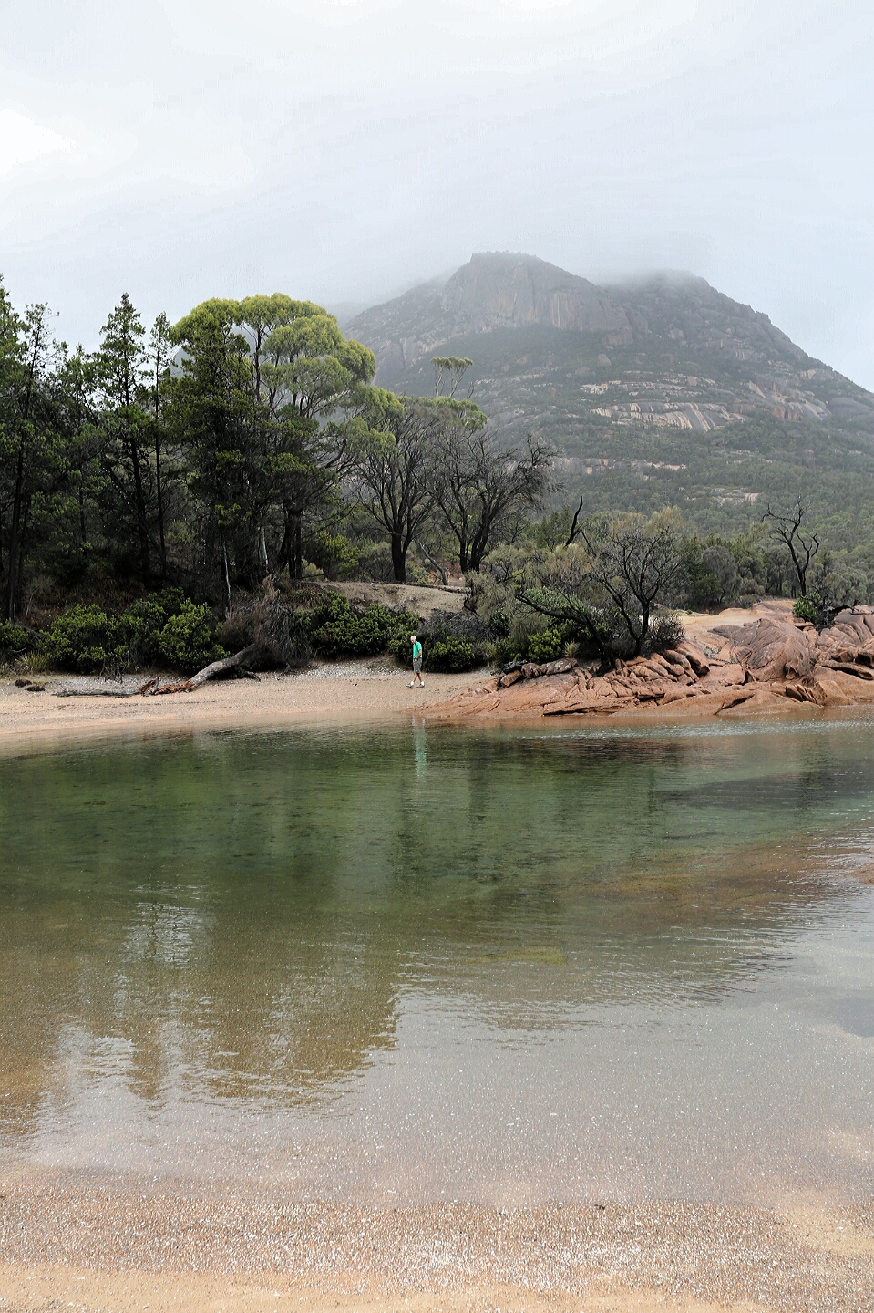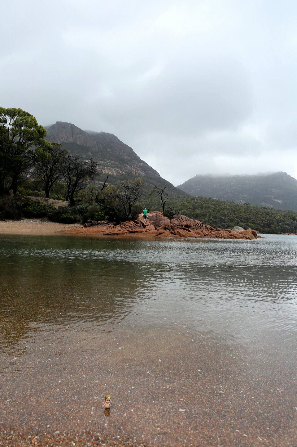 Day 2 – Next morning the sun was shining. Great we thought, perfect for visiting Freycinet National Park. But the sunshine was short-lived and before we even entered the park, the grey clouds which were hovering in the distance, descended and started a downpour. We sat in the car and waited for the rain to ease. When it did, we walked out to the Wineglass Bay lookout and then the lighthouse. The view we had did not match the tourist postcards. But it’s not hard to imagine that it would on a clear sunny day.