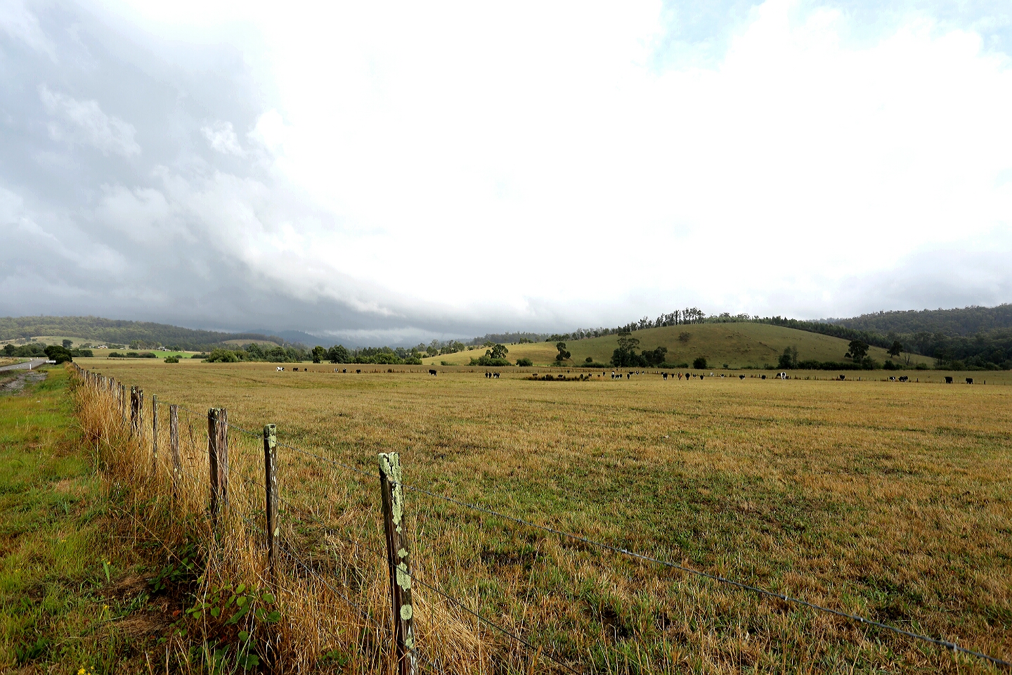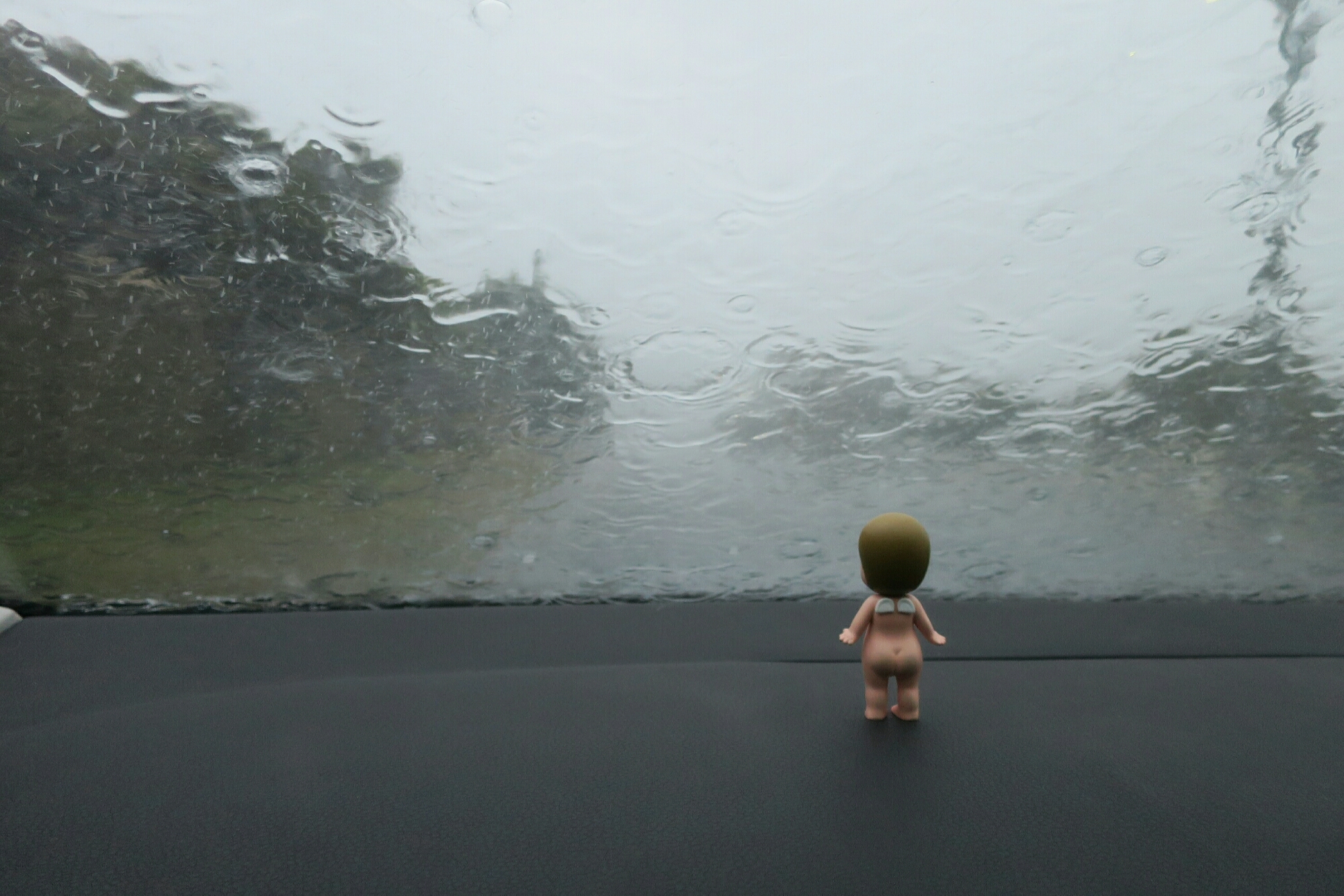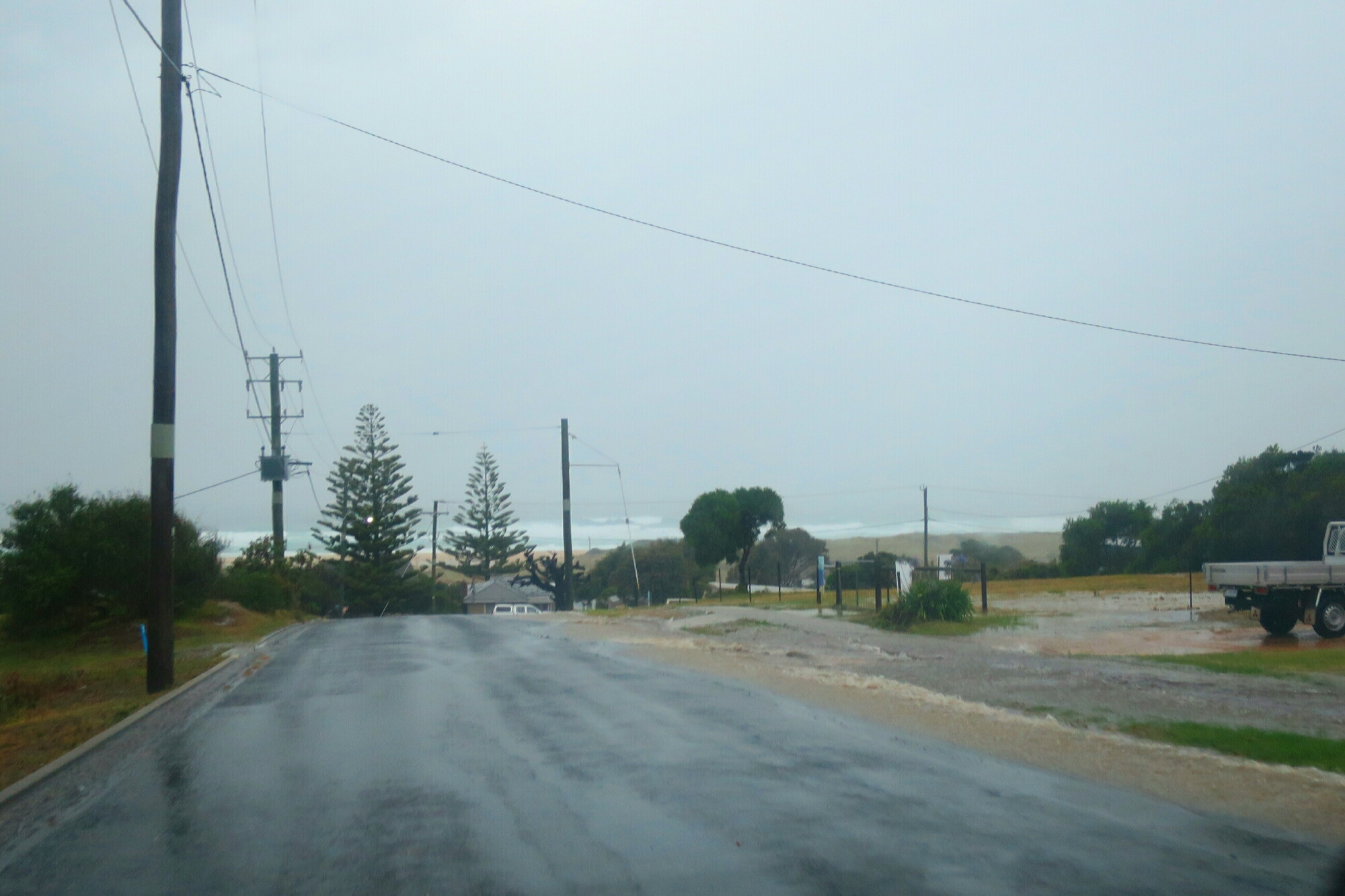 Day 3 – we survived a scary night camping out by the beach. We were woken at 2 am by a thunder clap and lightening that was so close we could smell the electrical charge. This went on for almost 2 hours. We packed up at first light while there was a break in the rain. A steady rain began to fall almost as soon as we headed out. We were feeling lucky to have survived the night, staying dry and that we managed to pack up before the rain started. By the time we reached Scamander the rain was so strong, it was a torrential downpour, the streets were flooded and you could not see through the windscreen of the car. It was frightening as there was nowhere to stop. Hammer saw a side street going uphill and drove across a raging flow of water to get uphill and to higher ground to wait for the rain to ease. Again just lucky not have been flooded in the car.