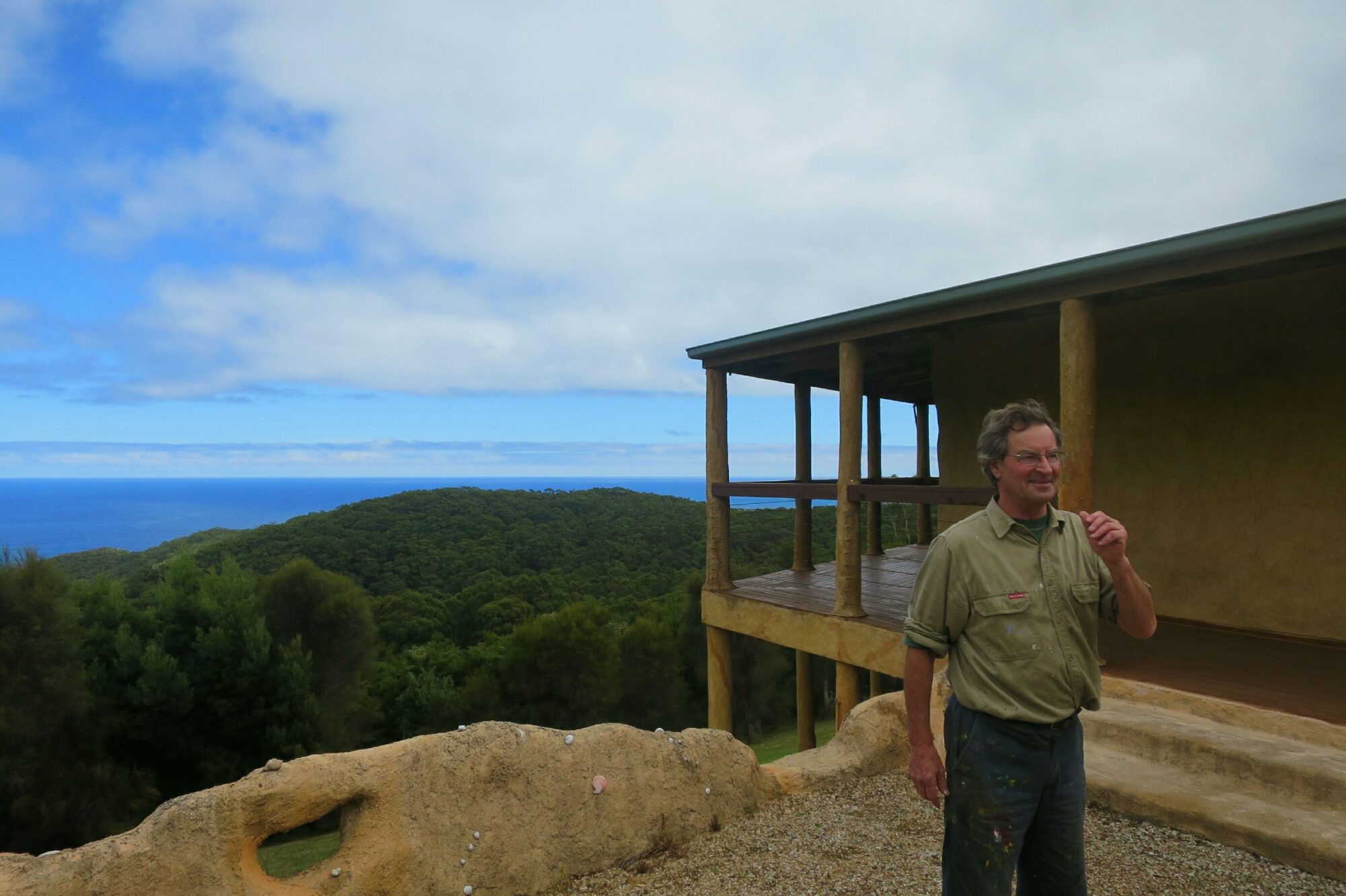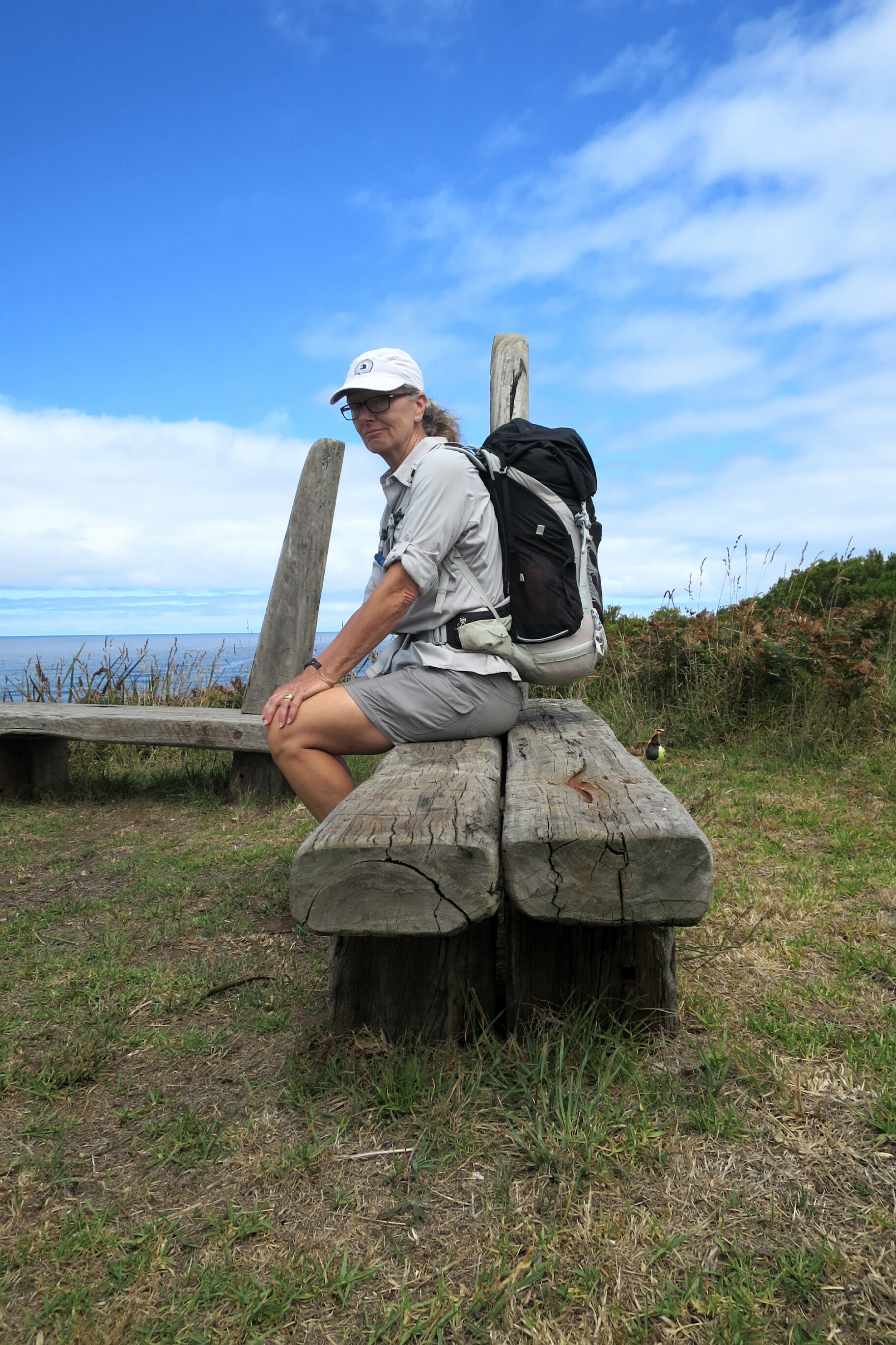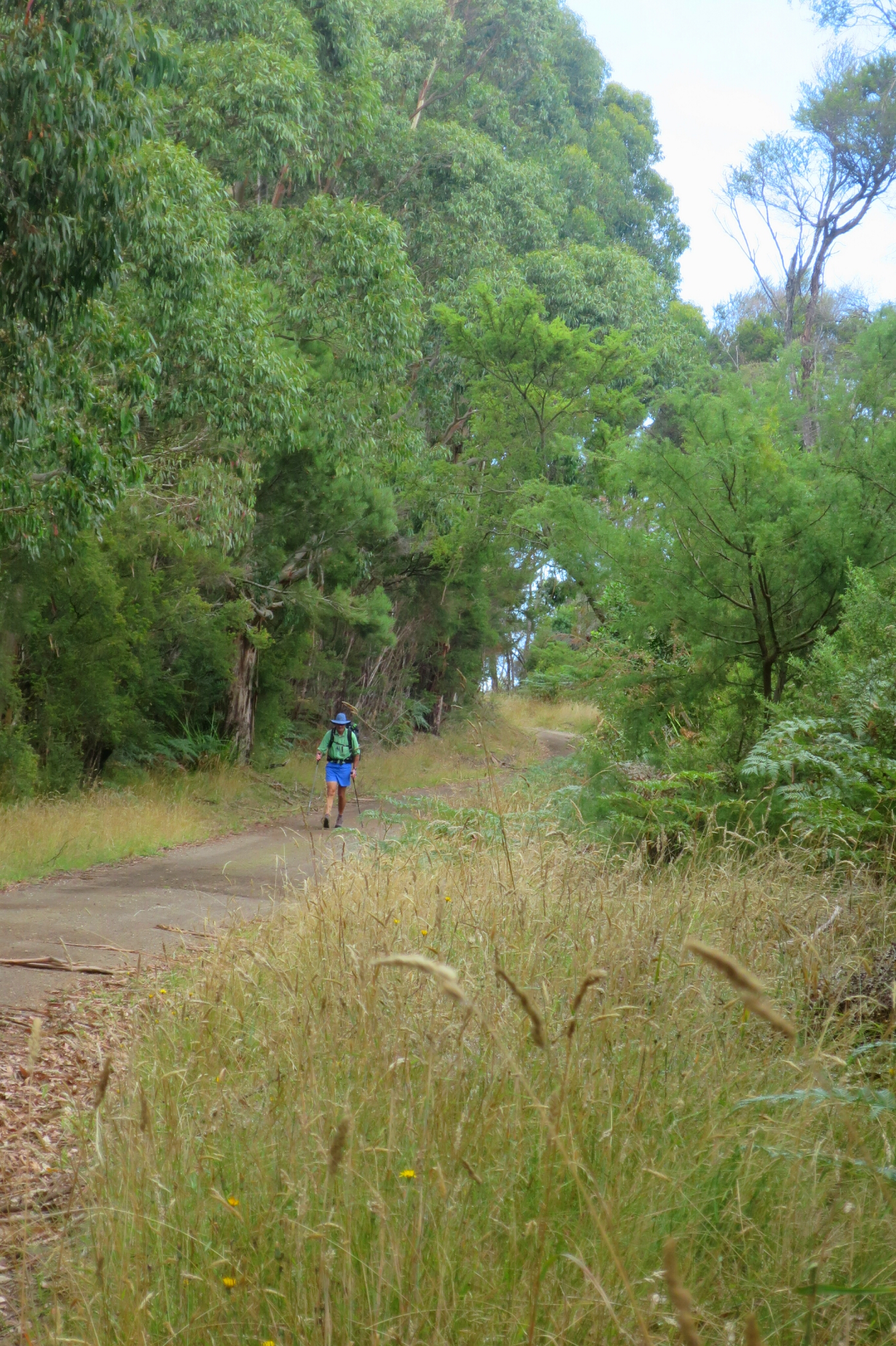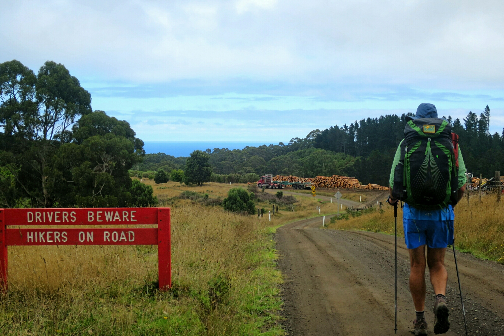 From Johanna Beach the trail deviates a long way from the coast, following an access road through farmland and surprising a plantation timber forest where logging was underway when we walked past. Walking along here was hard and we needed walking poles to pick up the pace. Just before we came off the road we had our very first experience of trail magic. The owner of last house on Milanesia Road had sat up a hiker water station equipped with containers of drinking water guarded over by Captain Bob. The owner was in the garden so we stopped to chat. He ended up showing us his very impressive straw bale house with exceptional ocean views.