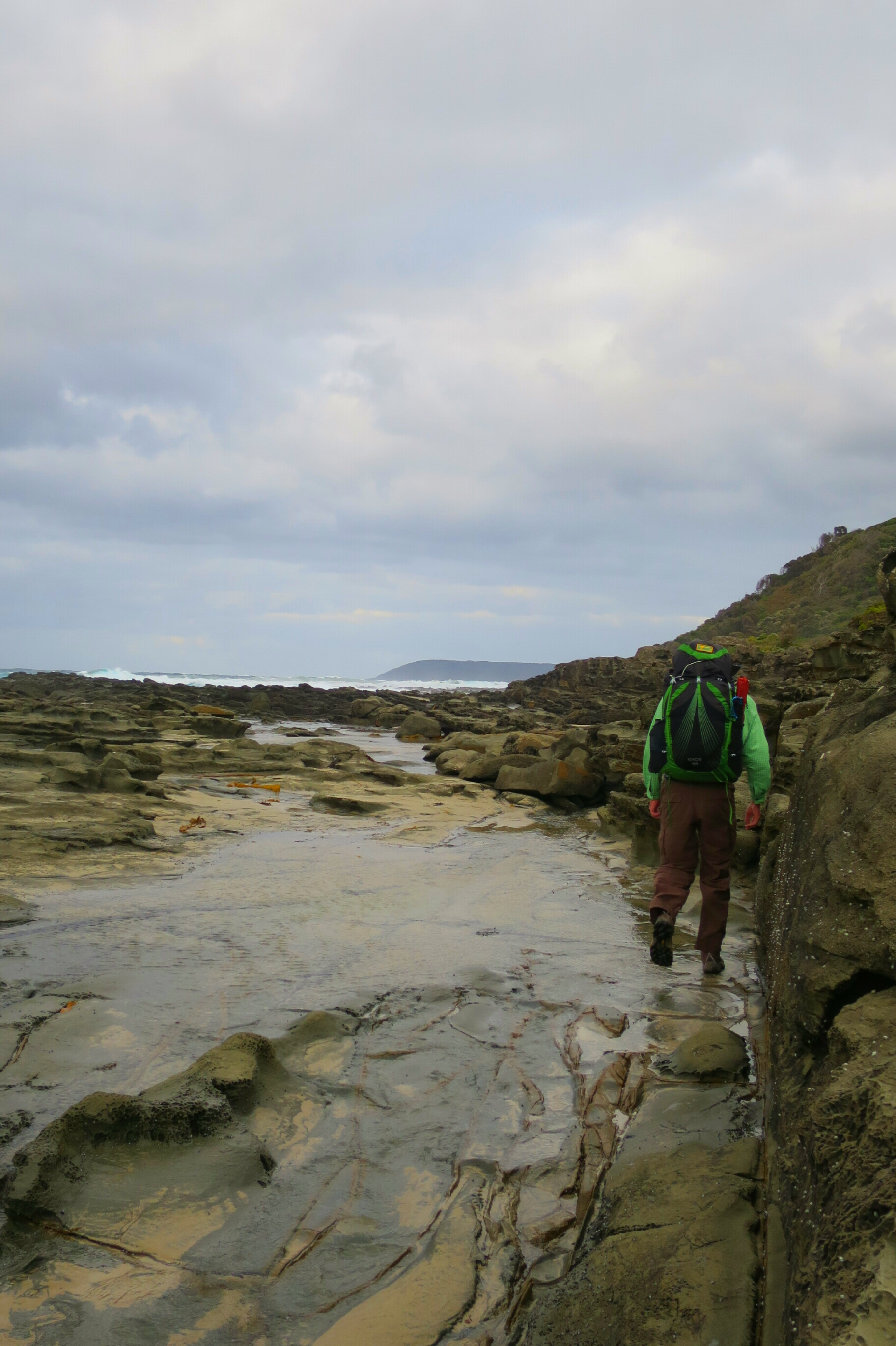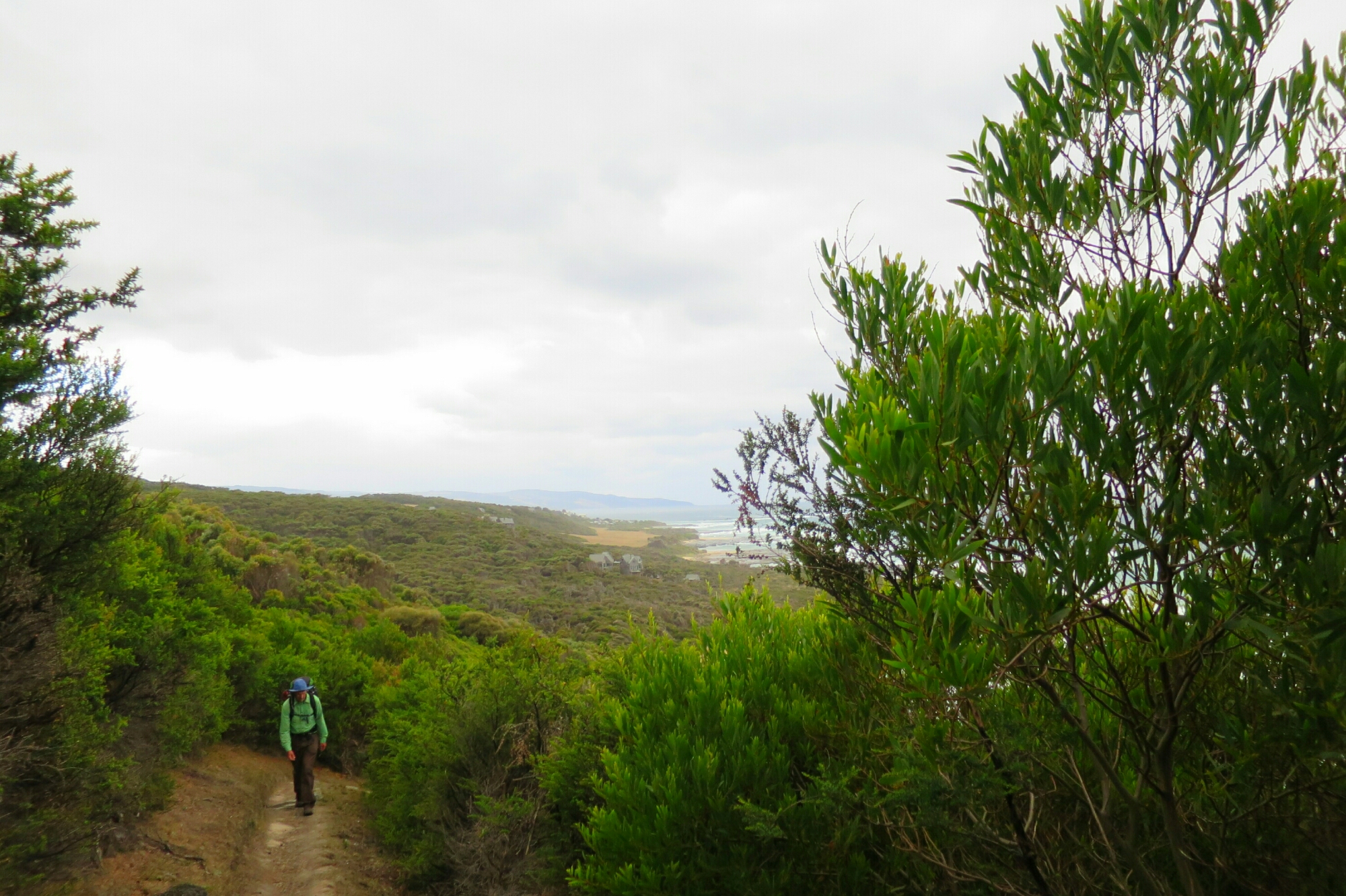 The first 2km of the trail wound around the foreshore of Apollo Bay and the neighbouring Marengo. Easy walking to get used to carrying a pack again. Once we left the town behind, the scenery was spectecular. Pounding surf and jutting out headlands stretched out as far as we could see. The fact that the wind was howling added to the wild nature of our morning. All the way to the first designated campspot at Elliot Ridge (at 10km), the trail alternated between rockhoping on the beach, walking on the sand or the cliff edge. We reached Elliot Ridge 3hrs after leaving Apollo Bay. After a short stop here and we left the campground and headed inland away from the wind and the surf.