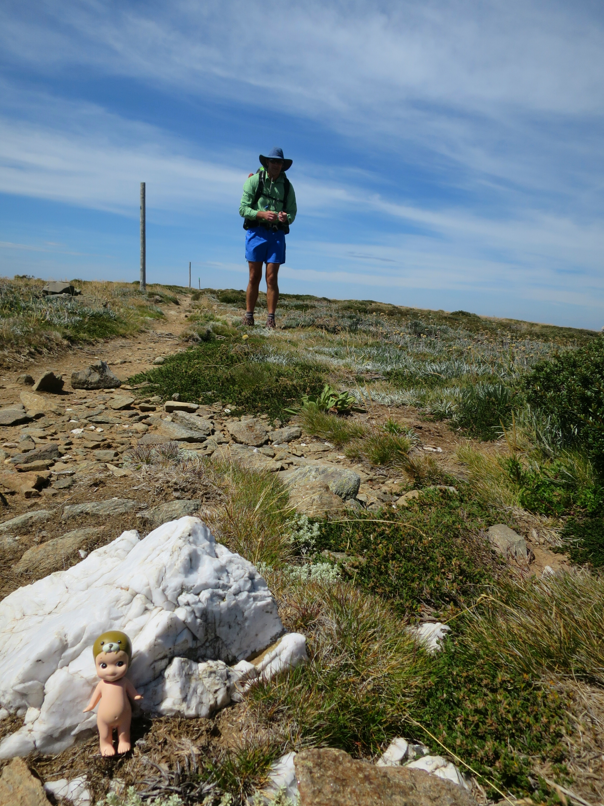 It was very windy on top of Mt Bogong. We huddled behind the rock cairn for a short while and then took off along Rocking Stone Saddle following the numbered poles towards the ruins of Madison Hut.