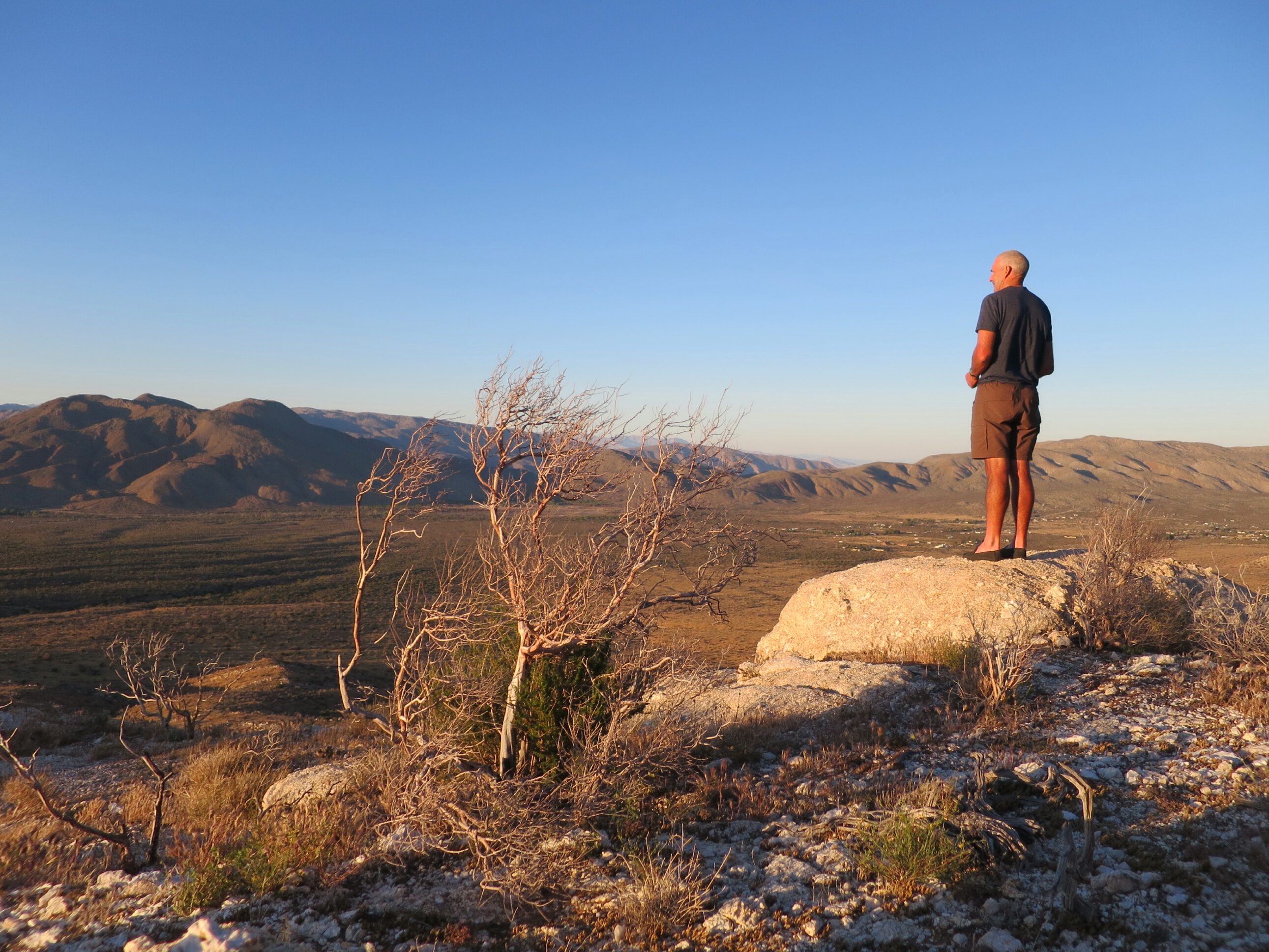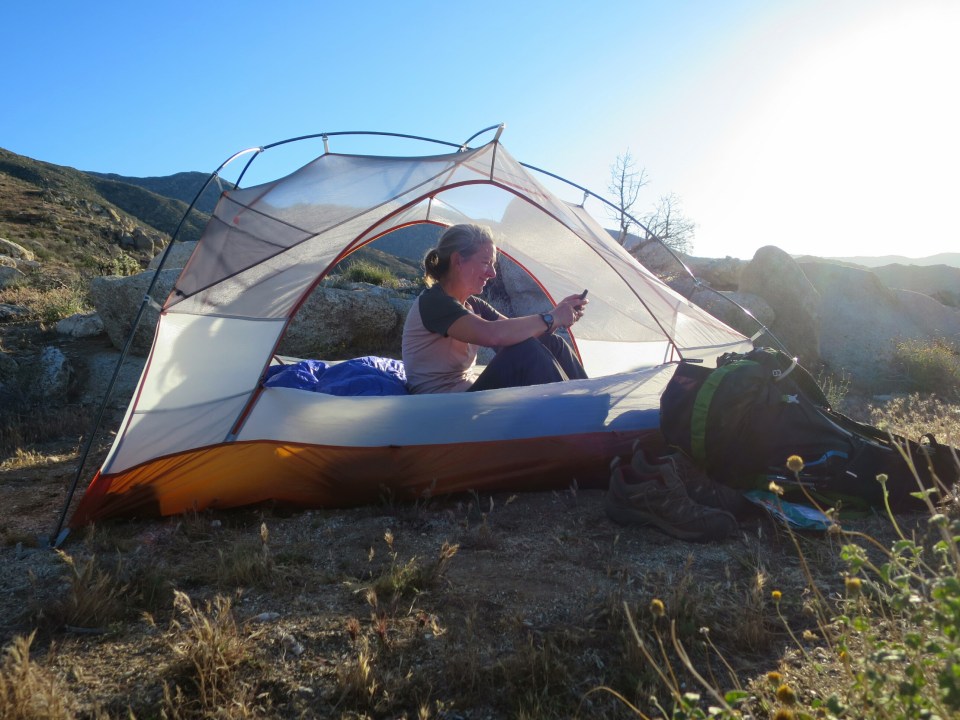We are camped on a ledge overlooking the valley below. A beautiful spot. The sun is about to disappear over the horizon and it is throwing a red glow over the rocks. The best camp spot so far on the PCT.