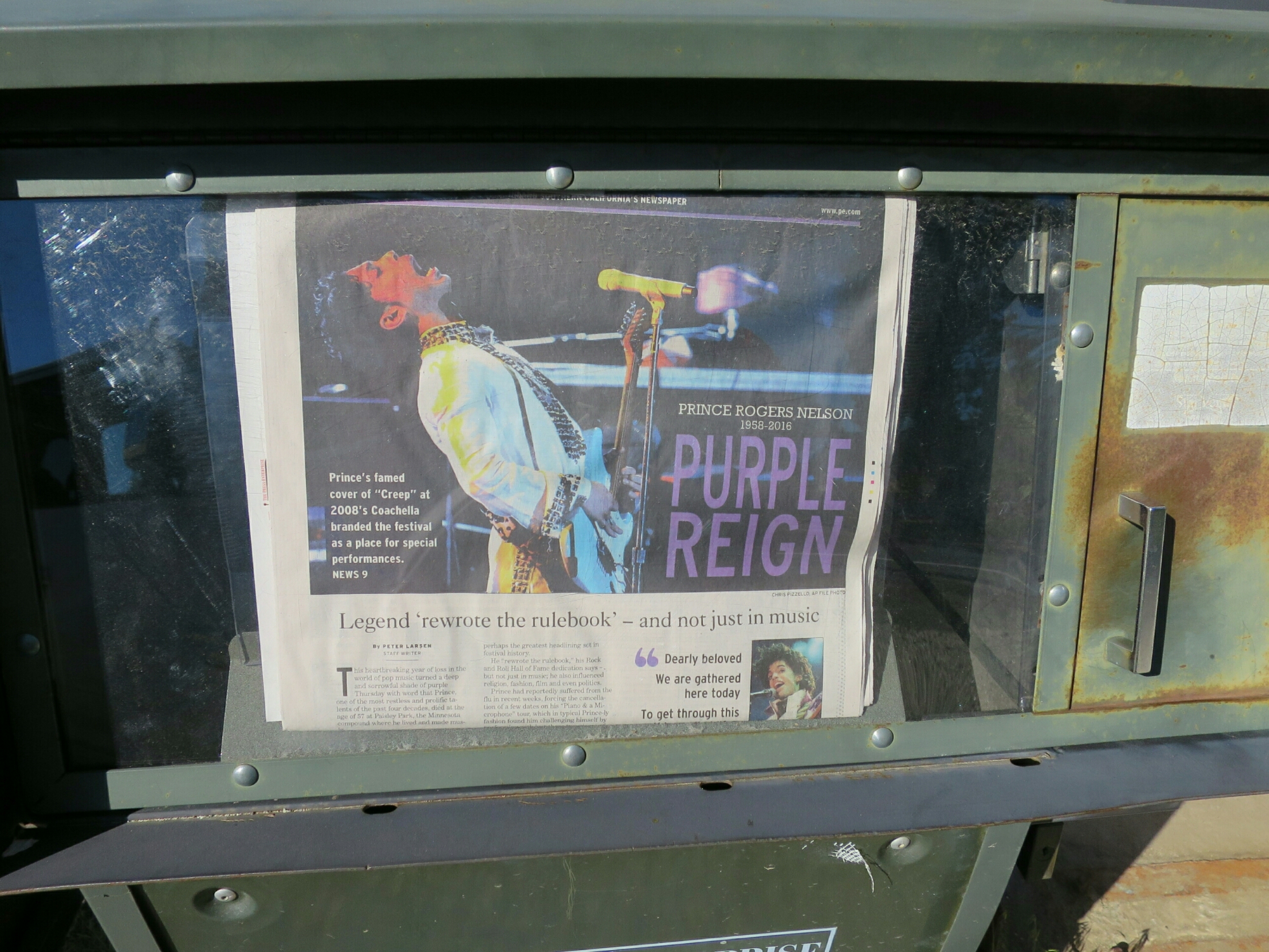 The walking along the Highway was OK early on. The air was still cool and the smell of the pines was lovely. Just like at Mt Laguna, a sweet, warm berry smell. Hard to believe we are surounded by desert. We passed mainly horse ranches. At one mail drop location there was a news-stand and I saw the headline about Prince passing away. Such a sad loss of a unique talent. Seems way to young