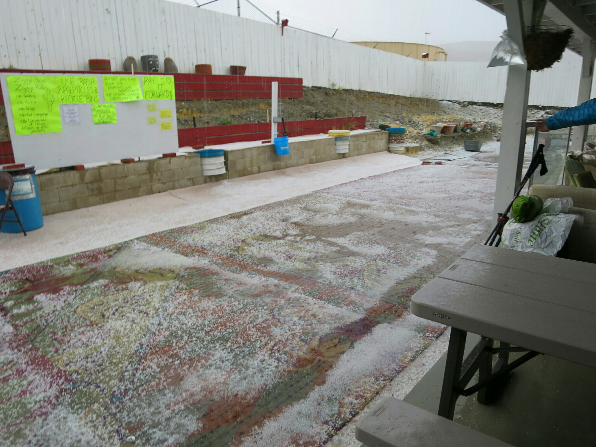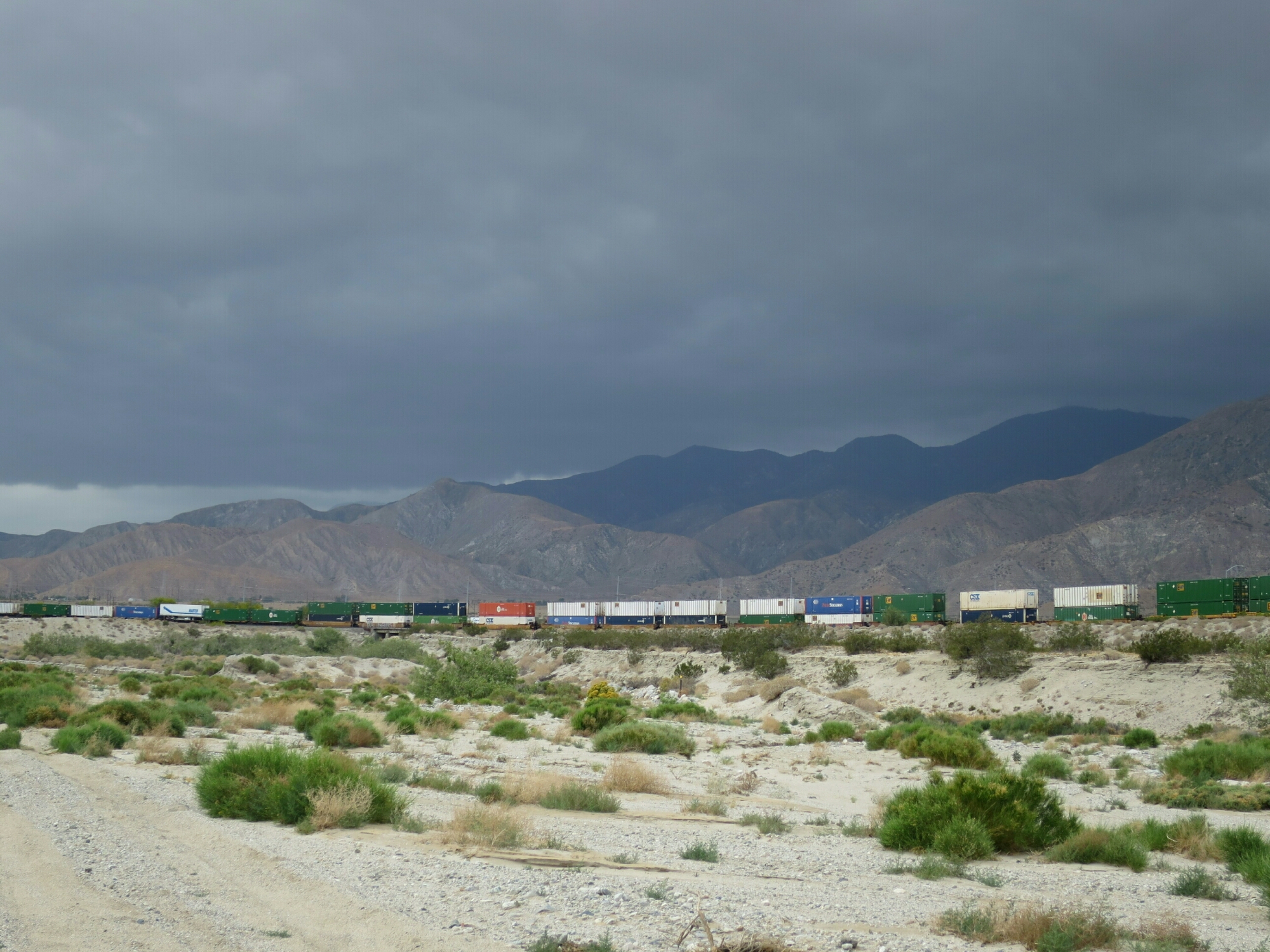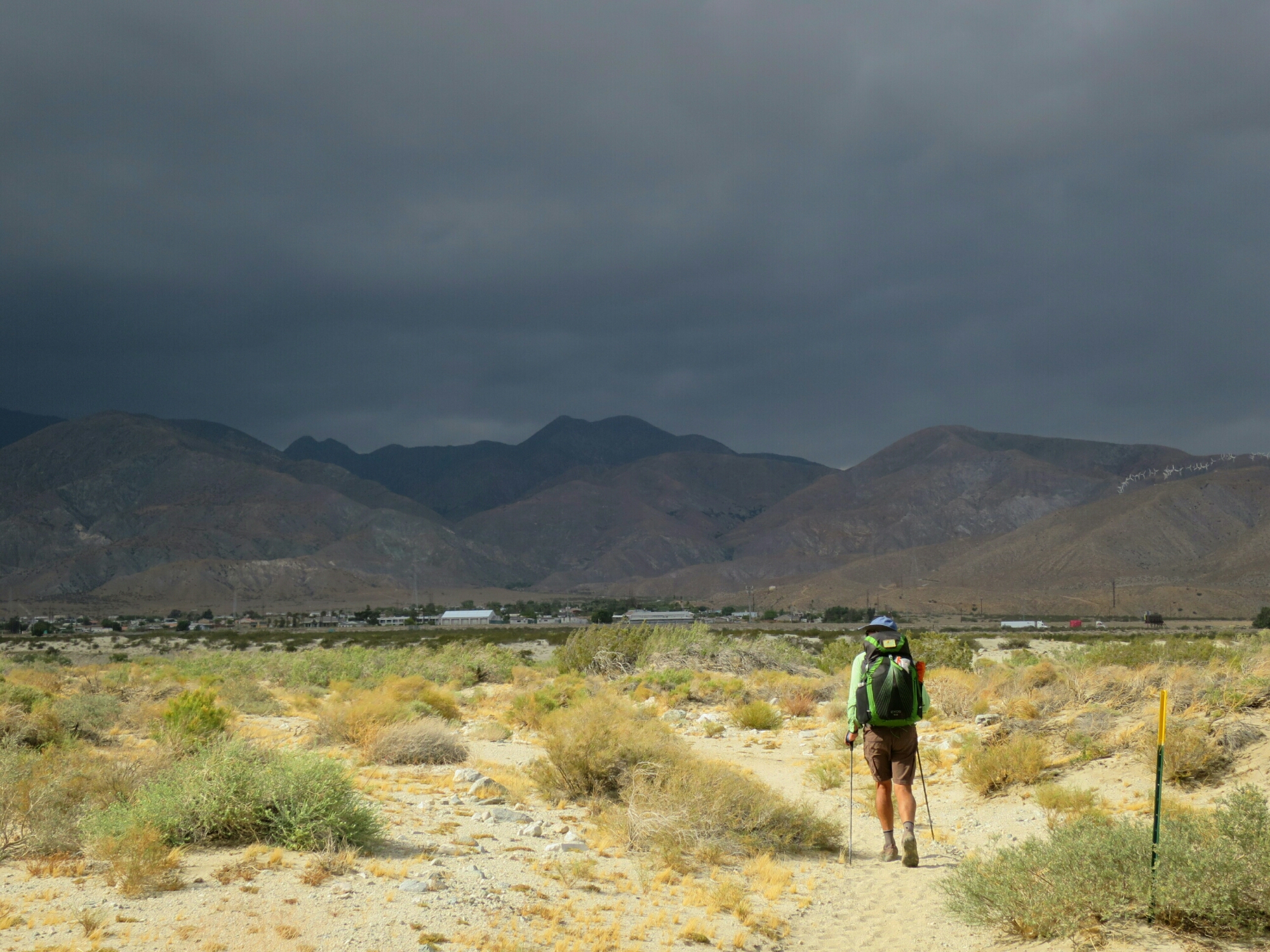 Very late in the afternoon we crossed under the very busy Interstate-10 and soon arrived at the famous Trail Angels house “Ziggy and the Bear” in Whitewater. Within half an hour of arriving, those dark clouds we watched, as we descended down the mountain, opened up and dumped a tonne of hail and rain which flooded their backyard. We were planning on staying the night at Ziggy and the Bears but with the wet and cold conditions there was no alternative but to find a motel nearby. Jack Rabbit, another Trail Angel helping hikers at the house, gave us and an English family hiking with their two kids, a lift to a motel in Banning.