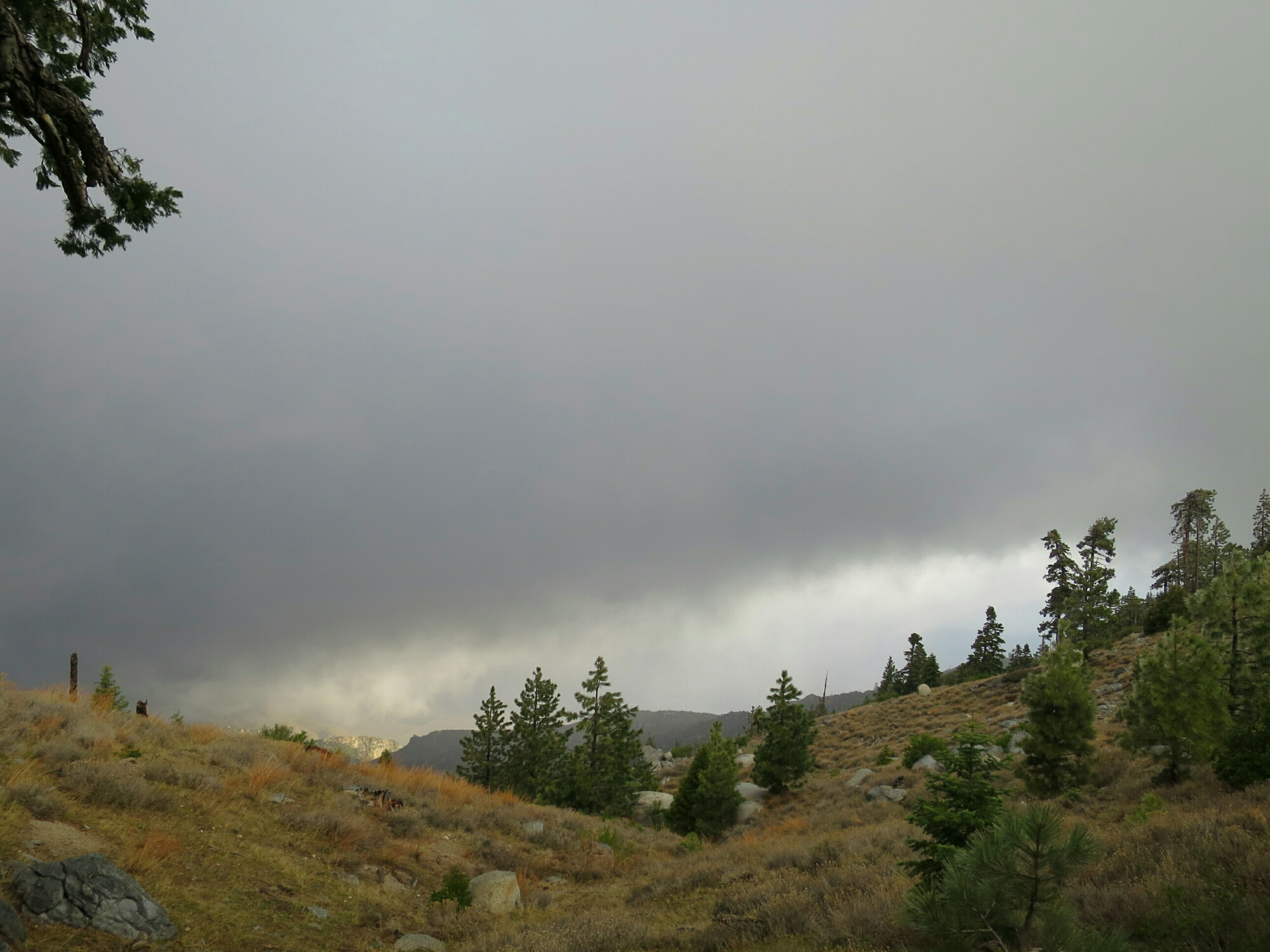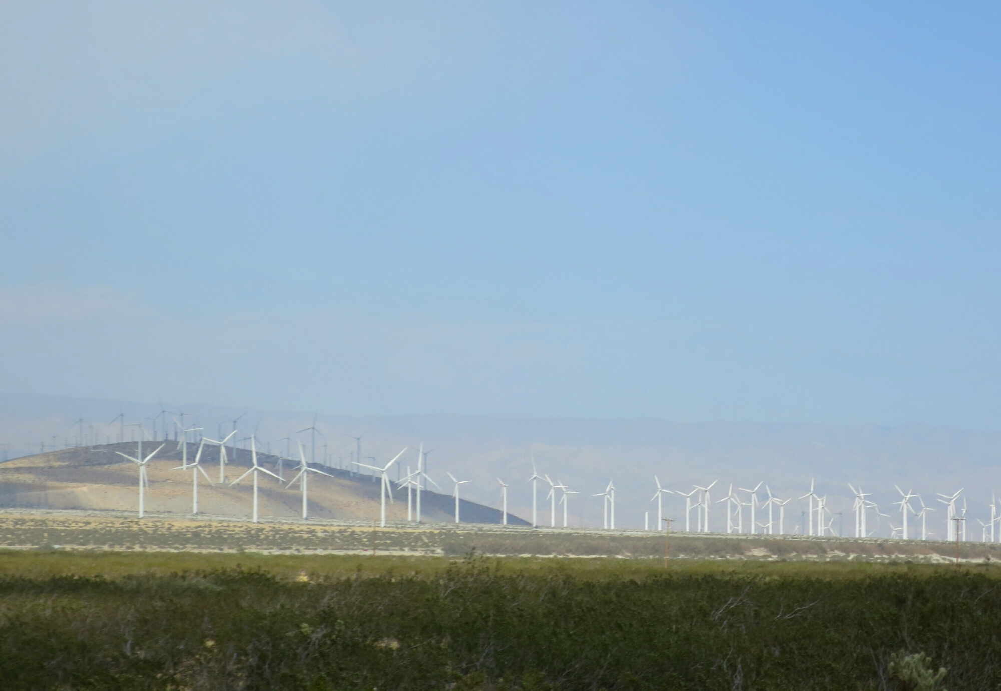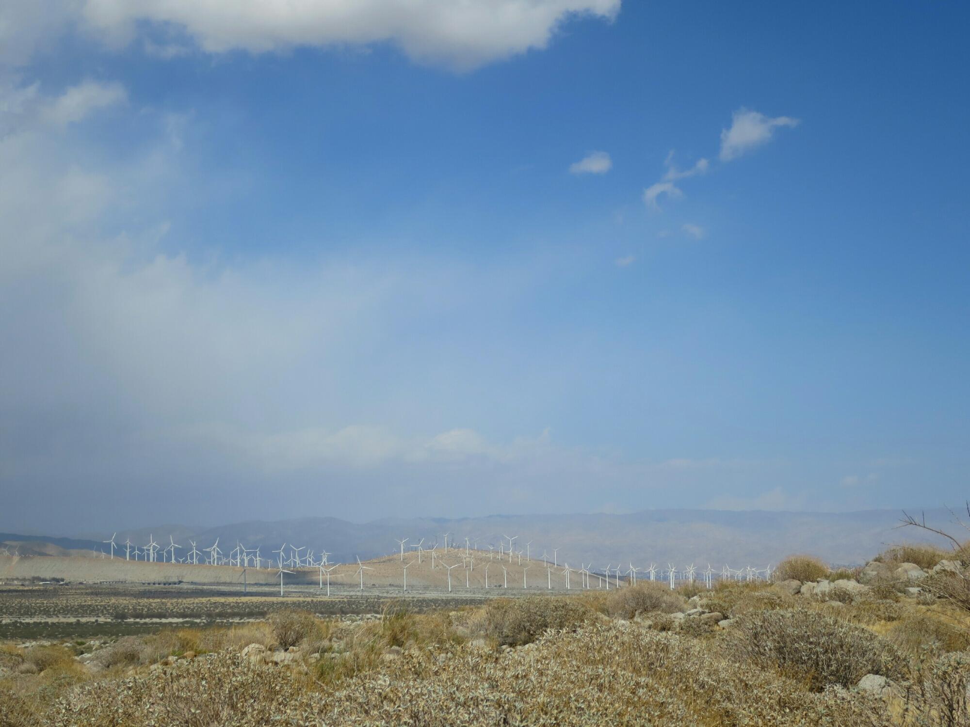 The hail followed us off the mountain for a couple of hours. Once we were out of the pine forest zone, the hail turned to rain. Eventually the rain eased off but the wind never let up. In fact, it stayed with us throughout the day. I guess this is usually a windy area, which would explain the huge numbers of wind turbines in the floor of the valley. The clouds looked so dramatic with an occasional peak of the sun breaking through. As we descended closer to the desert floor the sunny breaks became more frequent. But there were dark clouds on the horizon to the west.