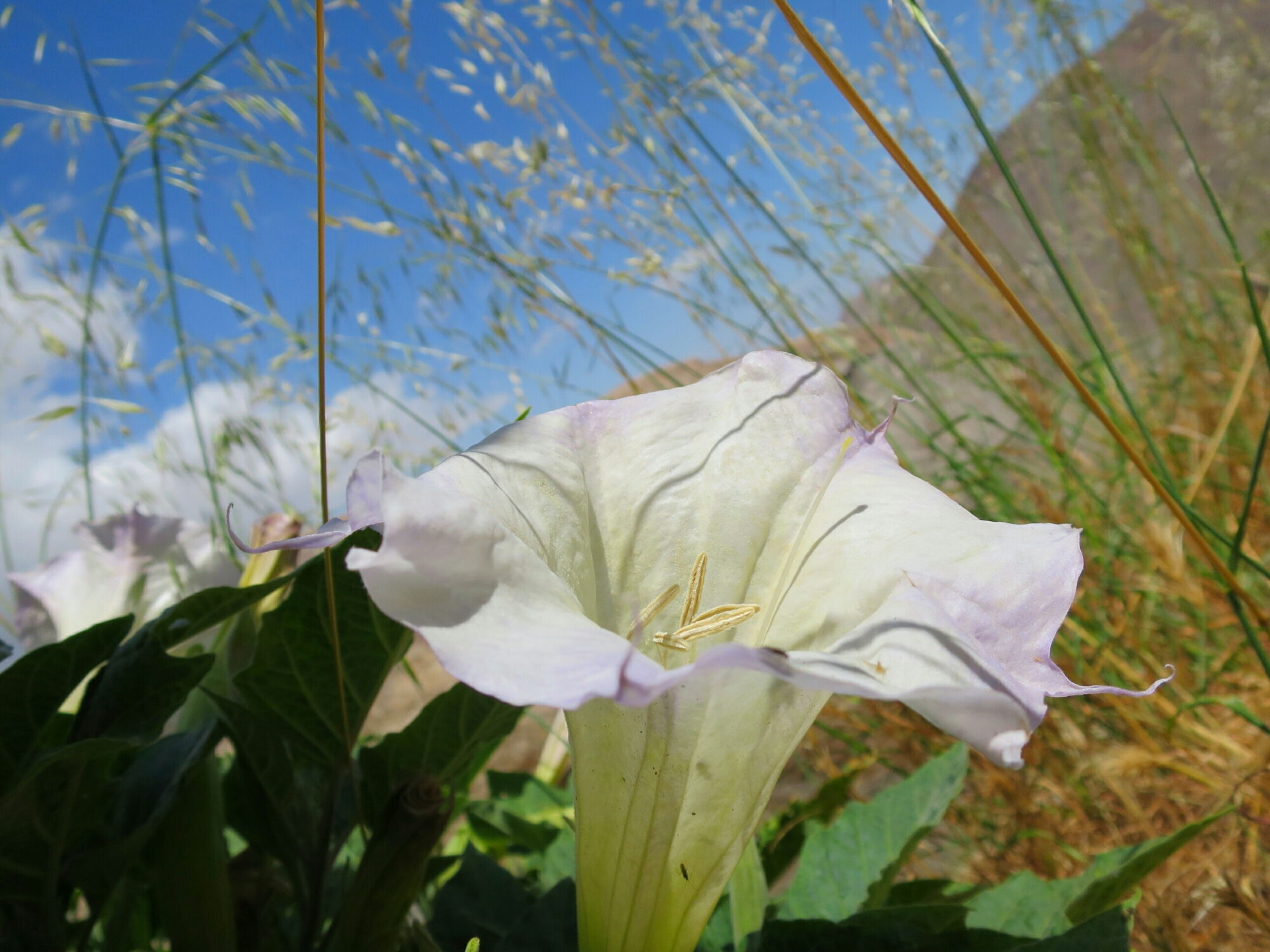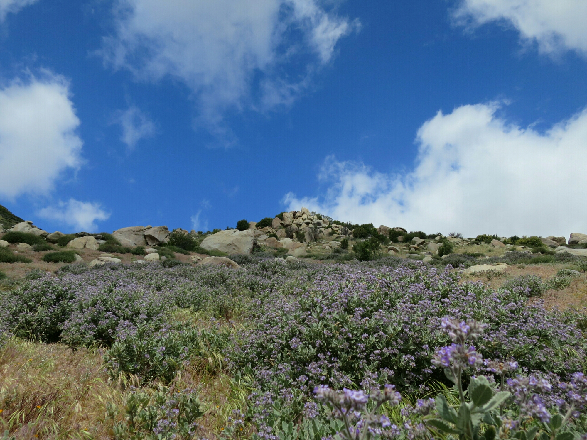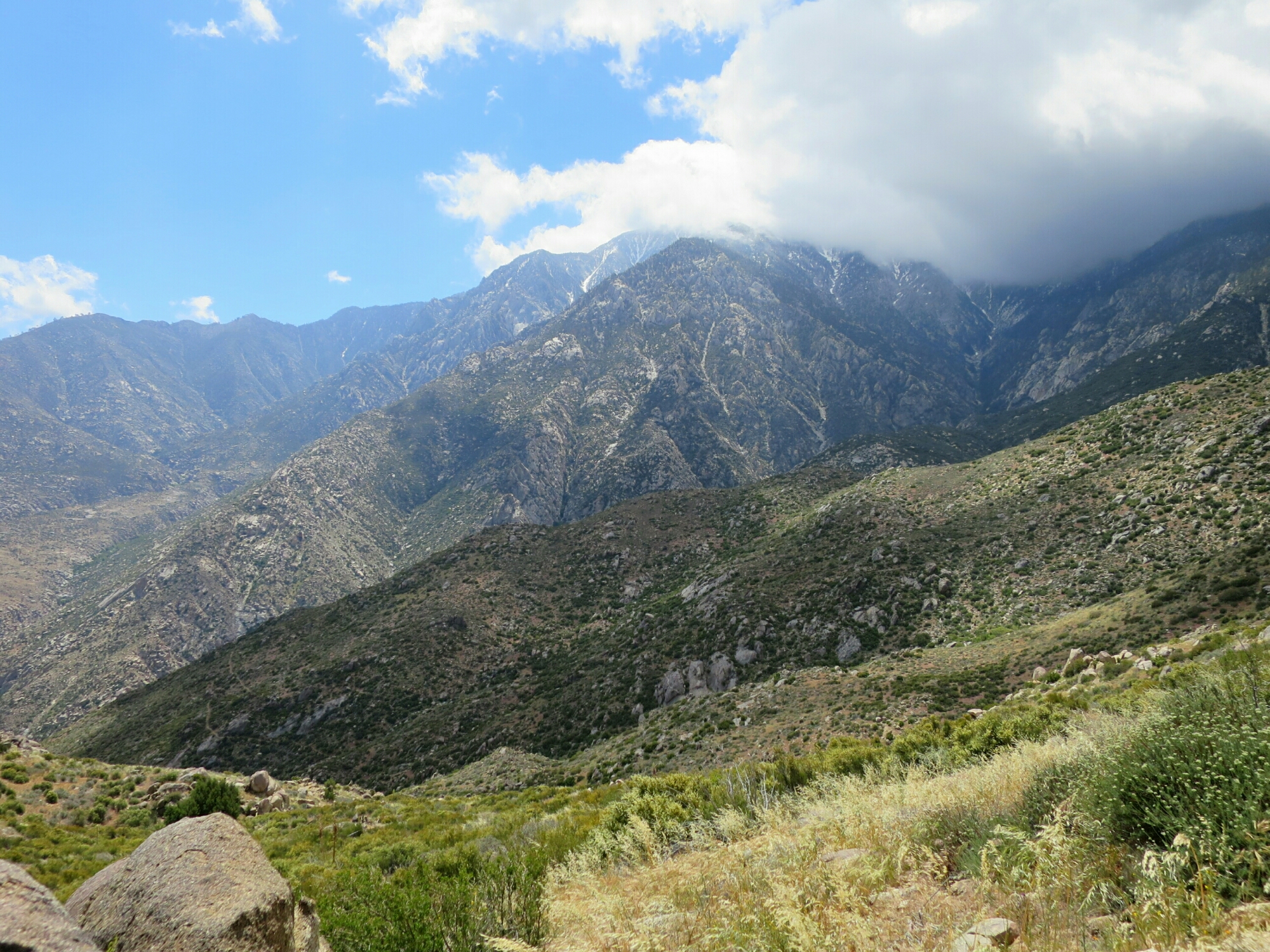 The hail followed us off the mountain for a couple of hours. Once we were out of the pine forest zone, the hail turned to rain. Eventually the rain eased off but the wind never let up. In fact, it stayed with us throughout the day. I guess this is usually a windy area, which would explain the huge numbers of wind turbines in the floor of the valley. The clouds looked so dramatic with an occasional peak of the sun breaking through. As we descended closer to the desert floor the sunny breaks became more frequent. But there were dark clouds on the horizon to the west.