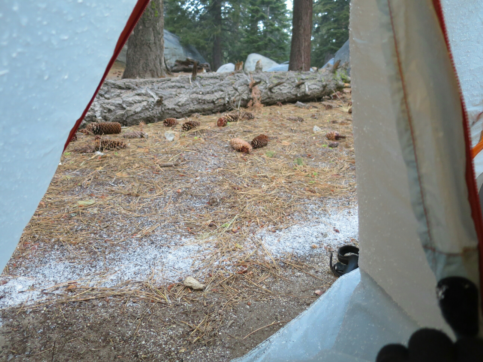 Well, we are so confused about this crazy weather. This morning we woke to a tent covered in very fine hail. Remarkably, for such a windy night, we both slept really well. Except that Hammer had to get up twice to resecure the rainfly vestibules which were being blown against the tent.