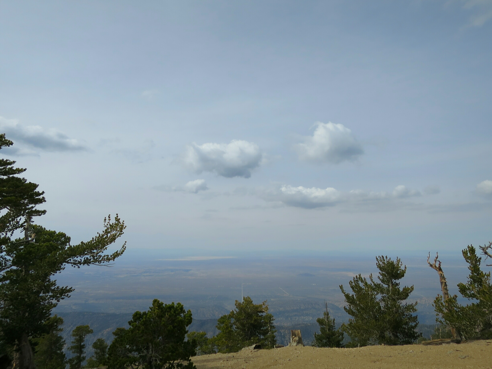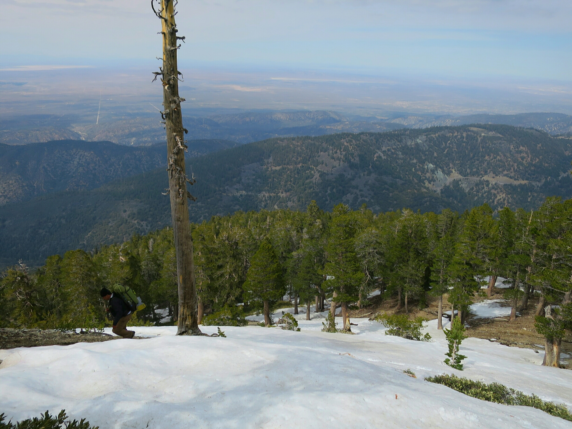 The crossing through the snow ended up being an adrenaline charge. The snow was icy and on very steep slopes. Now this was real preparation for the Sierras. We were happy to make it to the summit without any incidents. On a clear day there are views from the summit all the way to Los Angeles and the Catalina Islands. Sadly not today, the air was a bit hazy to see too far out. Still great to see the desert below. Still hard to believe that we are in the desert.