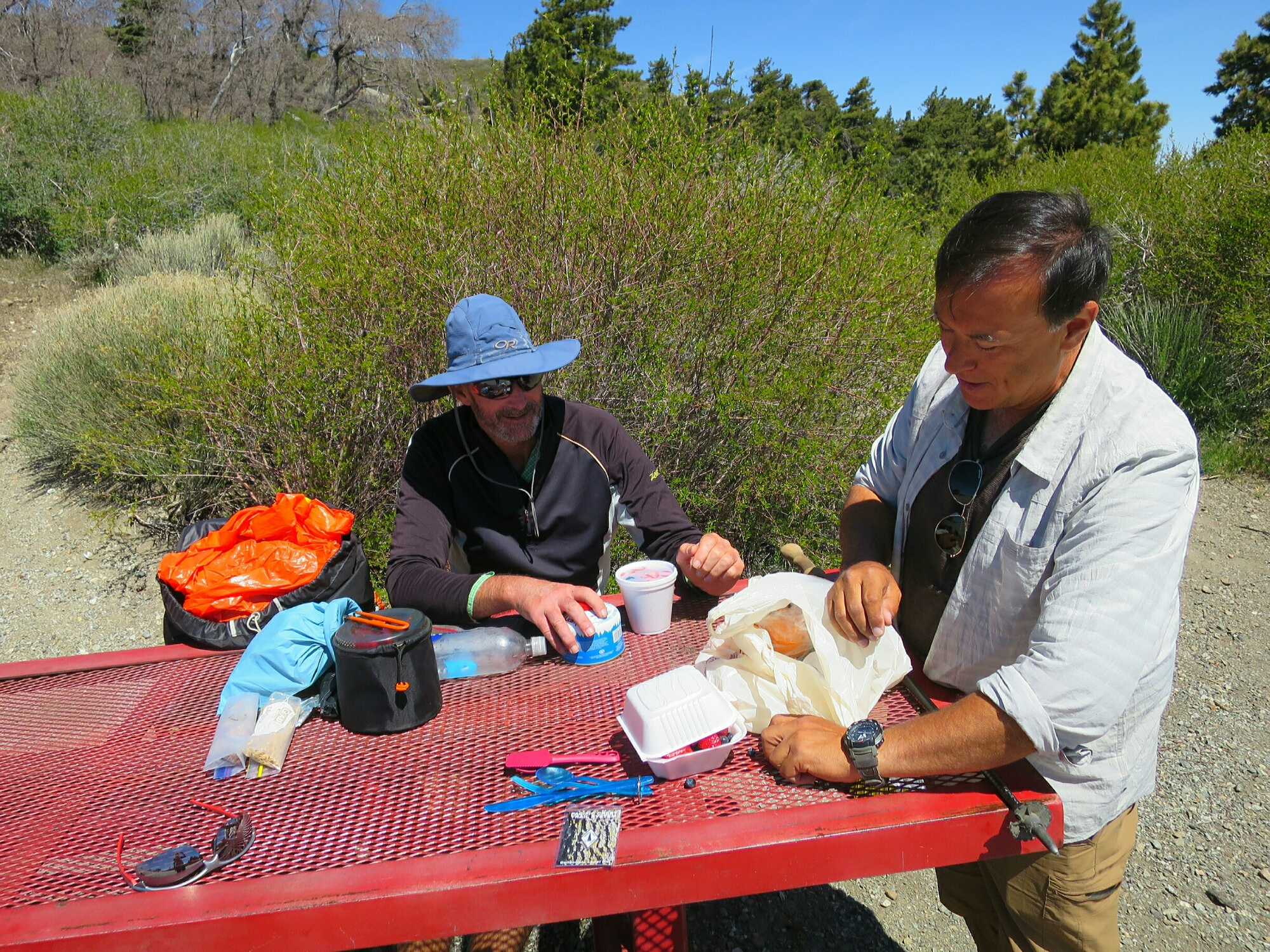 Where the PCT crosses Highway 2 we waited to meet up with fellow hiker Jim who was coming back on trail from Wrightwood. He very generously brough us cooking gas, spoons and a real treat: a tub of fresh berries. We sat in the sun enjoying the sweet berries with views out towards the high peaks of Mt Wright and Mt Baldy. Such a delicious treat.