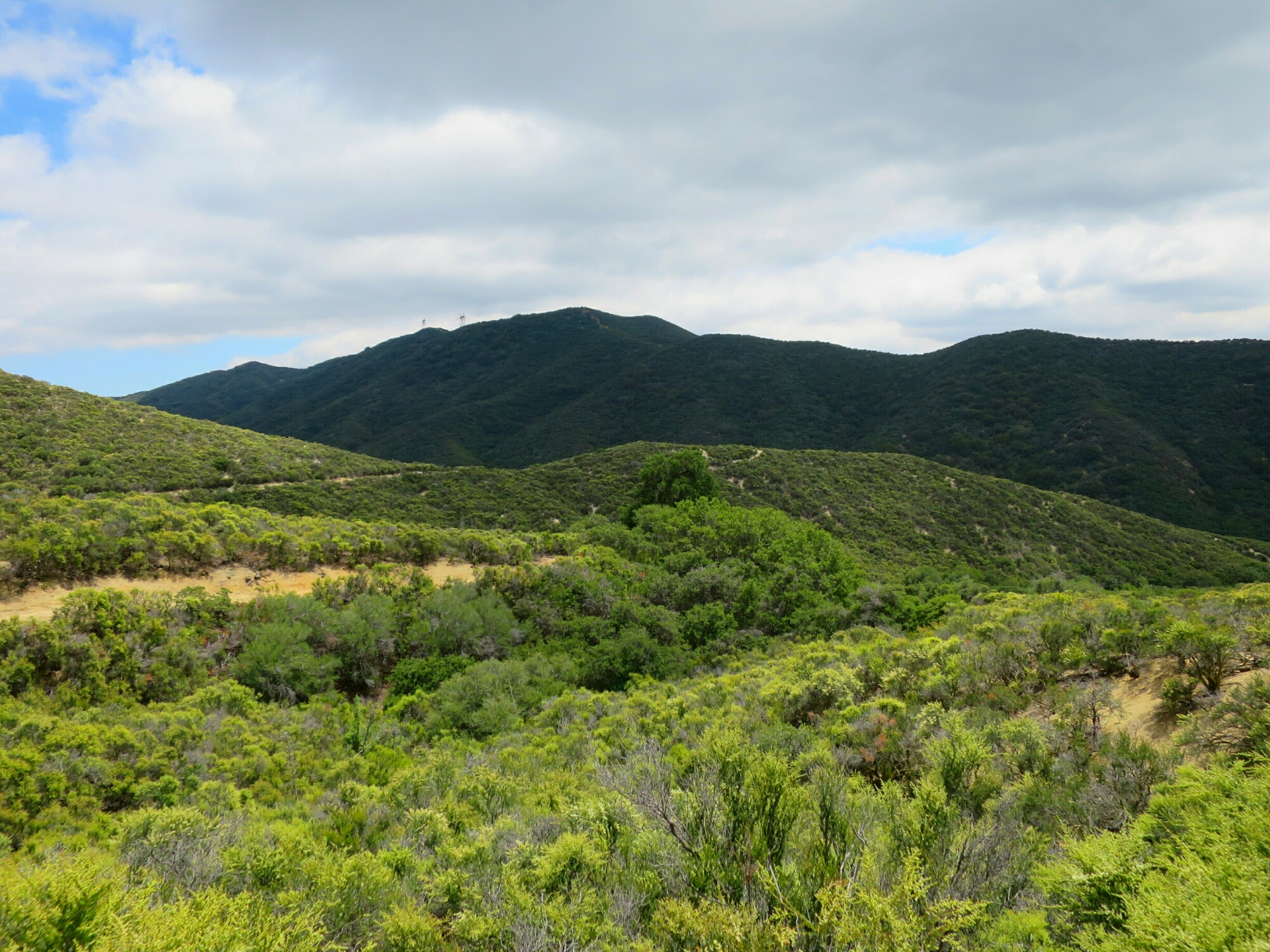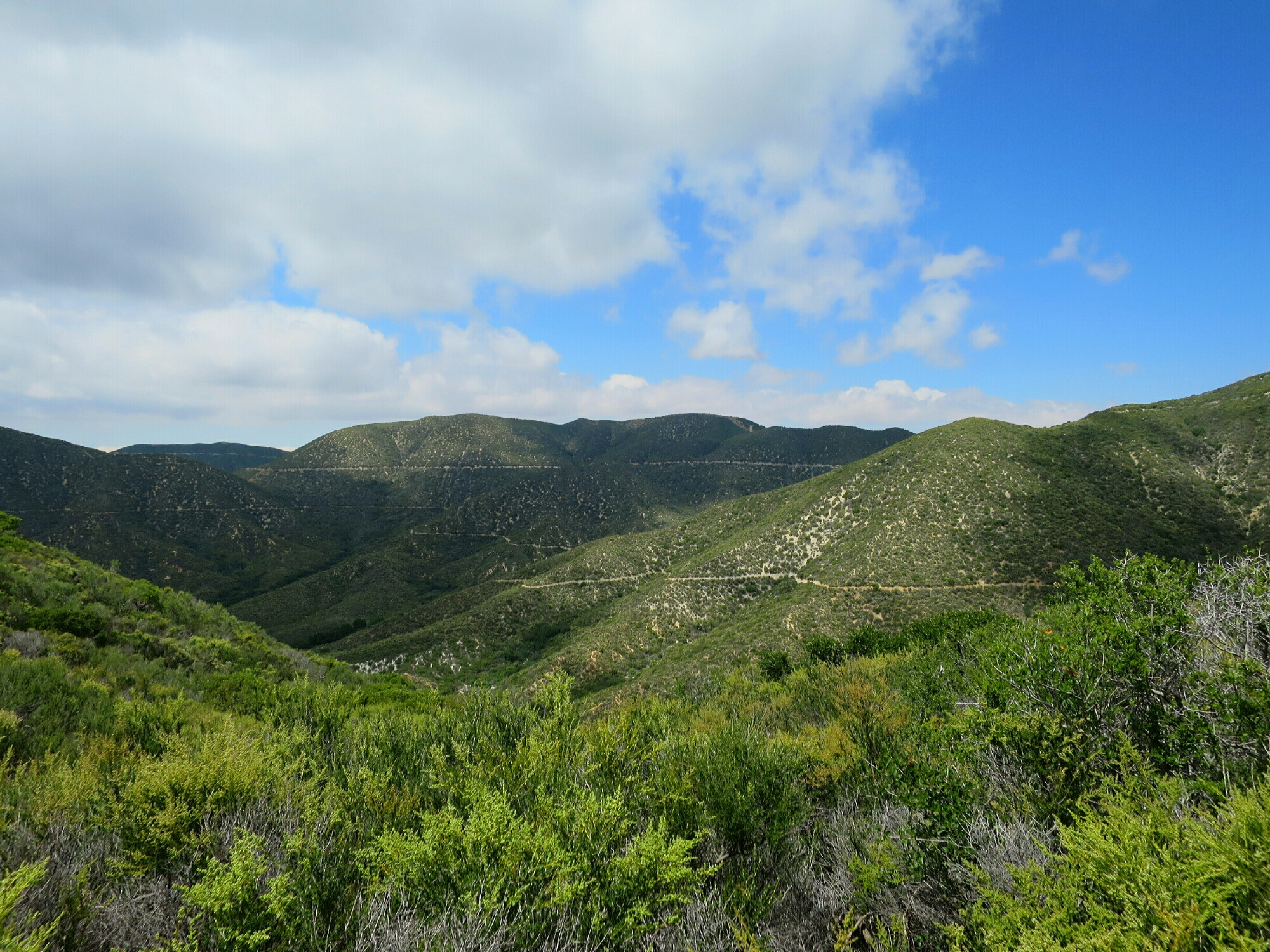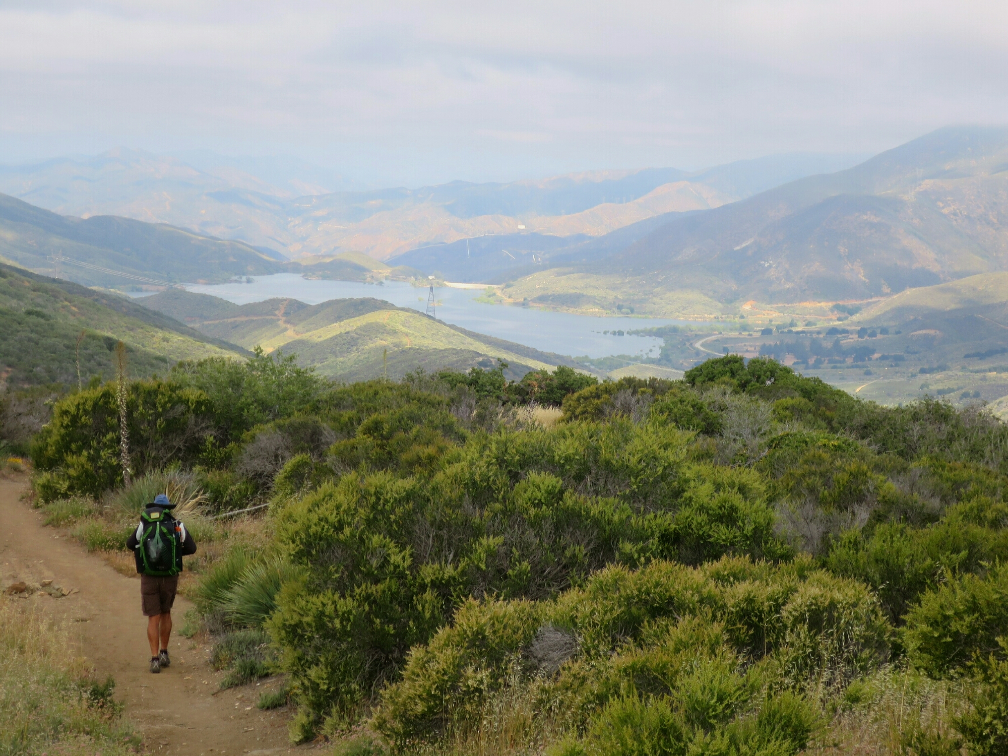 Once we dropped onto the other side of the ridges, the sun came out and warmed our backs as we hiked towards Bear Spring to refill on water. While waiting for the water to filter at the spring we watched a lovely hummingbird getting a drink from the water puddles. I was surprised by the fluttering sound of their wings. Such a big sound from such a small bird. I was happy to have seen a hummingbird up close. From the spring we descended towards Bouquet Canyon Rd which we needed to cross before starting another long ascent. Here we were treated by another kind stranger, another Trail Angel had left a water cache which also had mandarins and a few bottles of Gatorade. It was delicious to have a mandarin. Bouquet Reservoir was a huge feature of the landscape down in the valley.
