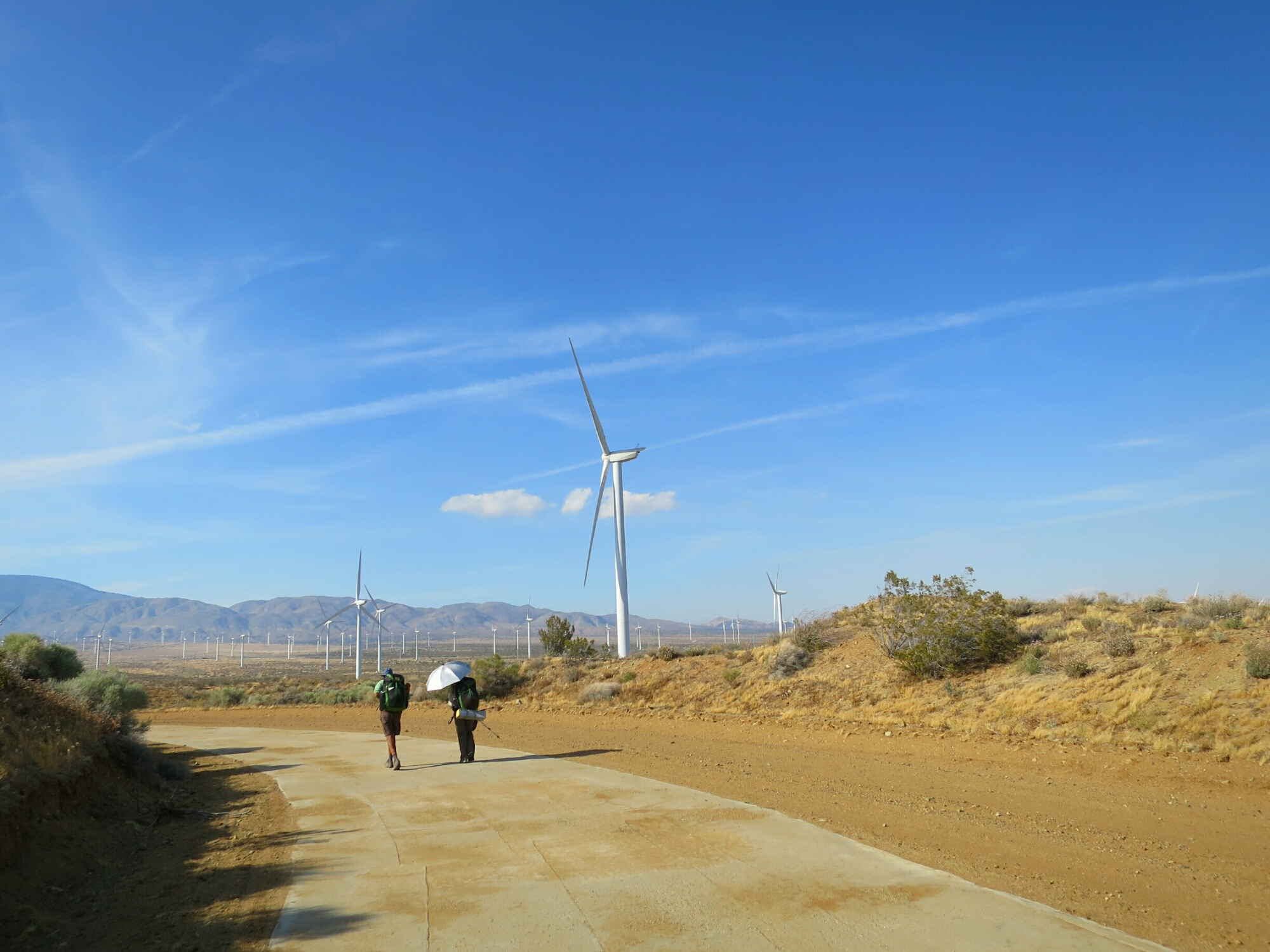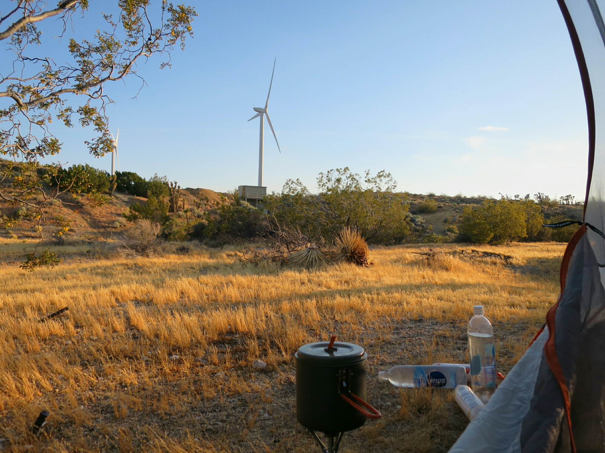 Slowly we got closer to our destination for the day, a water fawcet on the aqueduct just near Cottonwood Creek. The creek was completely dry but the fawcet tapped straight into the aqueduct. Another generous soul had left an ice chest filled with Gatorade right by the fawcet. We had a Gatorade, which was fantastic, and refilled on water and looked for a camp spot that was a little bit protected from the wind. We were surrounded by wind turbines. I had always wanted to see one of these close up and here they were. We set up camp and watched the sun disappear over the horizon. The turbines were silloueted beautifully against the evening sky. So tall, the blades continued to spin as the light faded. I was so tired I fell asleep before finishing this post. I woke up at 4.30am and it was a completely silent landscape. The wind had stopped and the turbines were still. Who would have guessed that we would have the best nights sleep ever in the middle of a wind farm?