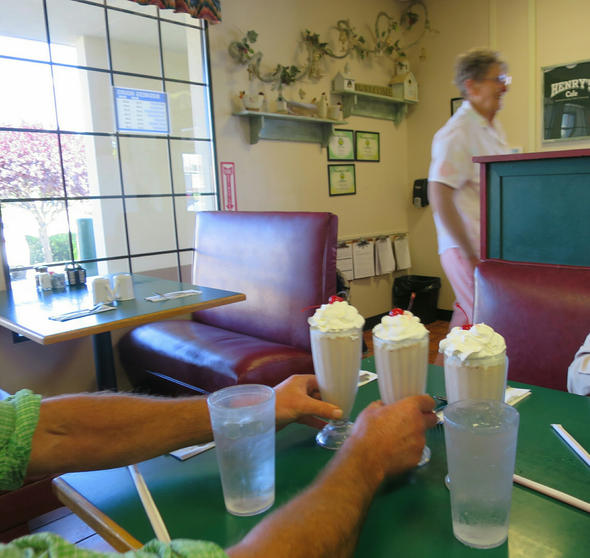 We got to Willow Spring Creek Rd which leads to Tehachapi and waited to get a ride for the 9 miles into town. Less then 5 minutes later a car stopped. Unfortunately he had no room for us but offered us water and oranges. So unbelievably kind of him. Less then a minute later another car pulled up and we were on our way. Great guy, on his way home from work as a diesel engine mechanic. Twenty minutes after getting off the trail, we were in Henry’s Cafe eagerly waiting for the chocolate milkshake we ordered and then breakfast. While having breakfast we made friends with Rick “Big Red” who is starting out on a section hike tomorrow. He gave us a ride to our hotel and his phone number to contact him when we get to Mammoth Lakes.