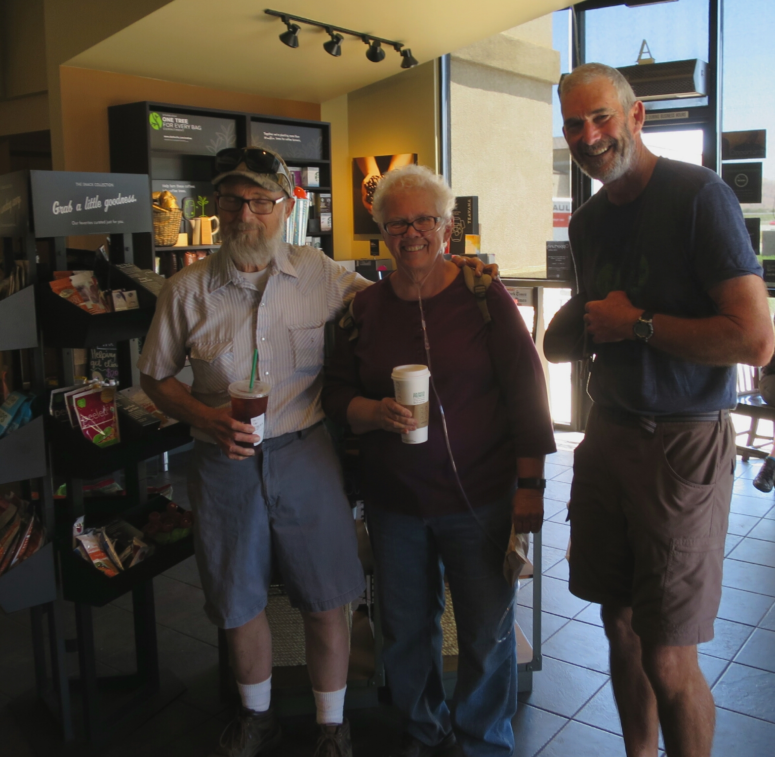 We stopped at Starbucks for coffee and while inside ran into a hiker we met a few days ago. Turns out he damaged some toes trying to jump out of the way of an aggressive green snake. And through him we met Larry and his wife who are the Trail Angels responsible for the most delicious apples and oranges we had out on the trail into Tehachapi two days ago. It was so nice to meet them and to thank them in person. Larry we learnt was a Vietnam Vet.