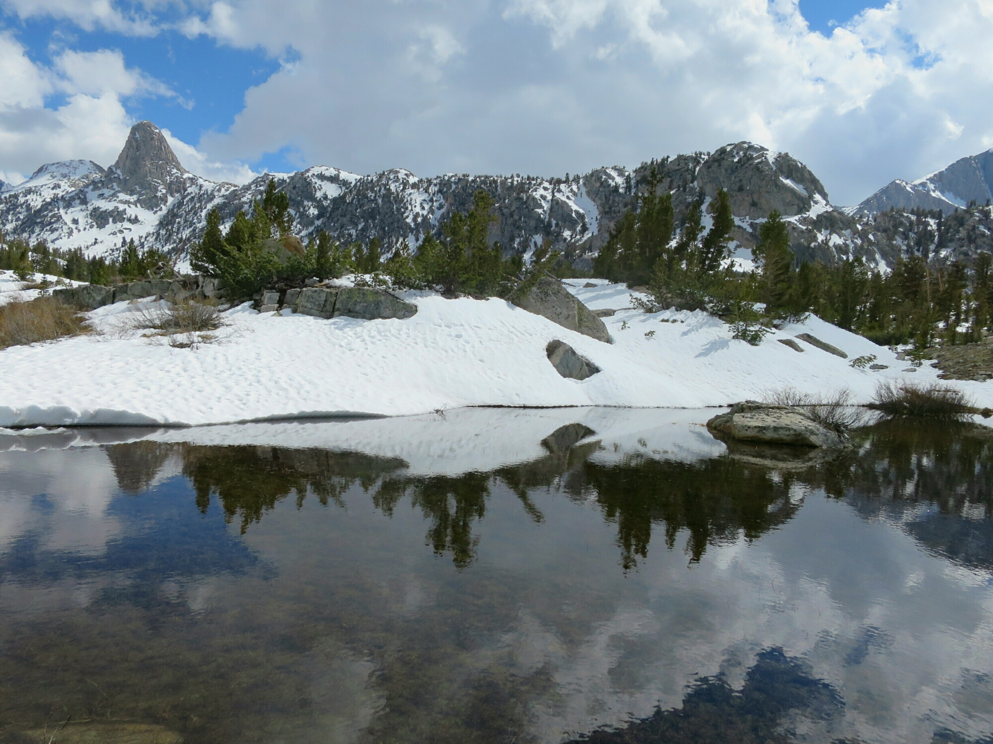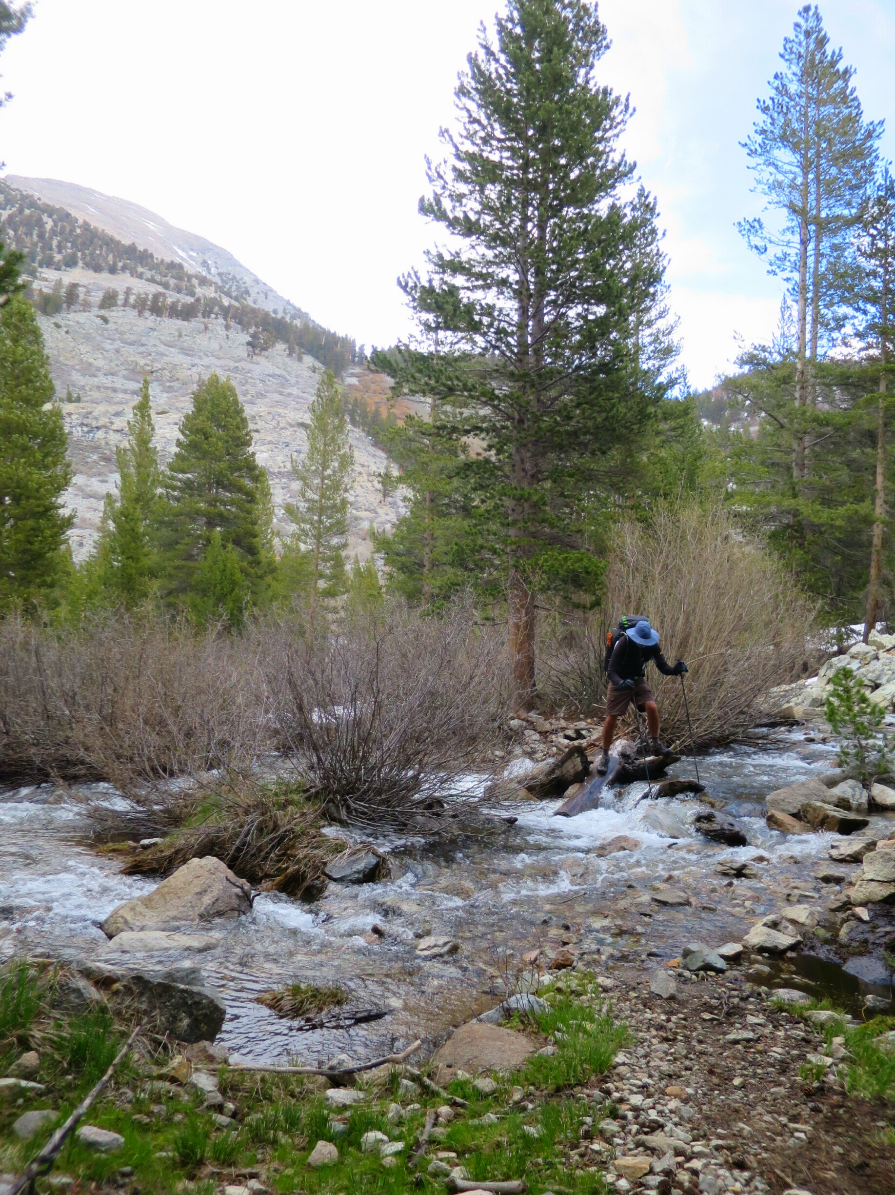 Even though we were descending, we were still not out of snow. We had a really frustrating section of snow hiking where the snow was undercut by upstream snowmelt. It was all on sharp granite scree. We kept sinking through the snow, worried that a sharp rock would scrape our shins as our feet sunk through the snow. And just as we were finishing with this section, 4 hikers passed us (Gillingan, Brian, Little Spoon and Cheese) and soon another 2 followed. And we passed a family of 3 heading in the opposite direction towards Dollar Lake. Amazing, we had only seen one person in the last 3 days. The northbound hikers had all been in Bishop for a rest and resupply and were coming back on the trail. So for the first time since leaving Kennedy Meadows we were camped with other hikers by the Woods Creek suspension bridge. It had started to rain about an hour before we reached the campsite and continued to fall while we were setting up camp. We were at relatively low elevation, at just over 8,500 feet hence the rain and not snow. You know spring has arrived here, we saw our first spring flowers since entering the Sierra mountains and we had mosquitoes. The last 3 miles coming into camp we had beautiful trail, clear of snow. So nice just to hike.