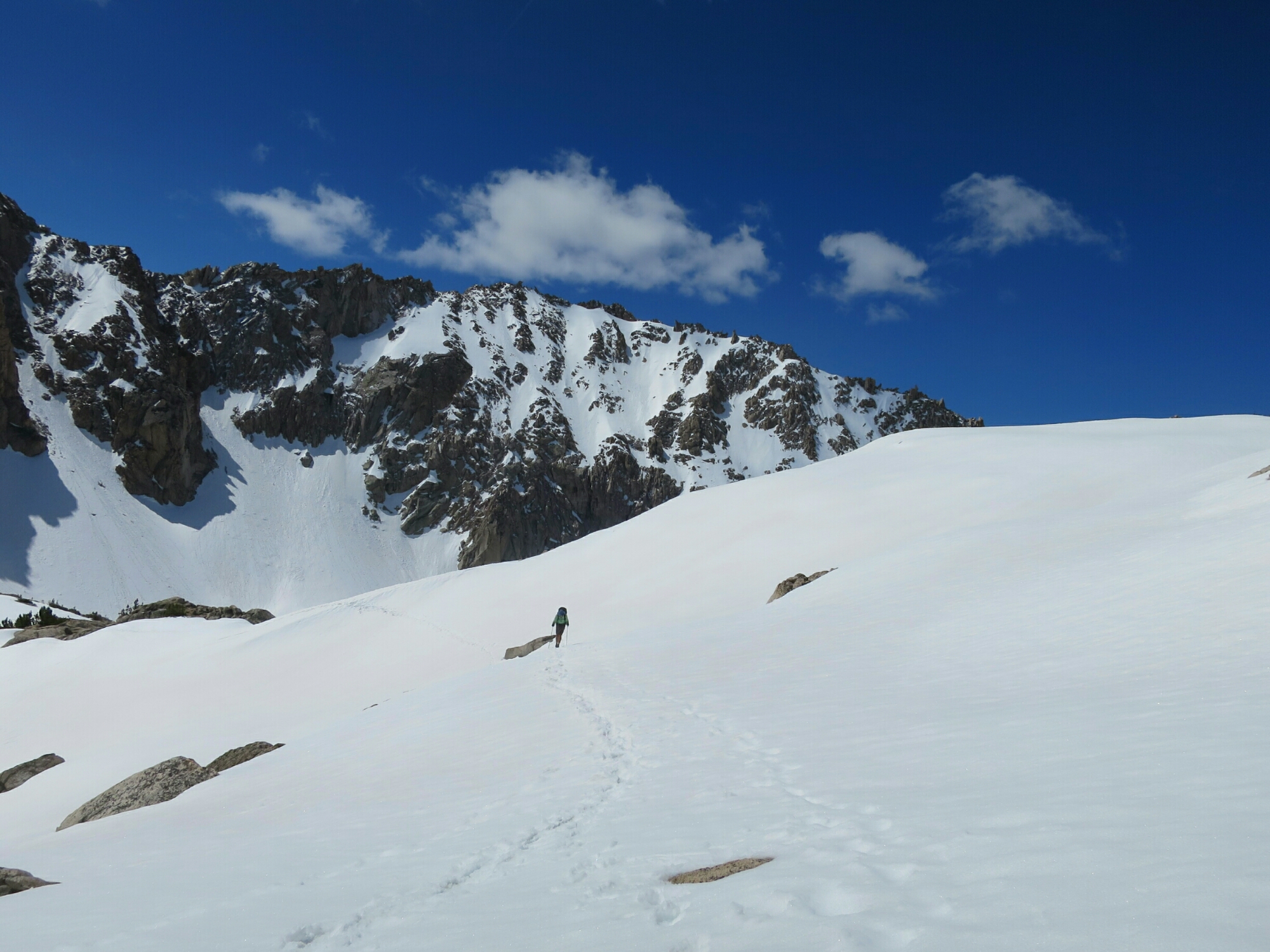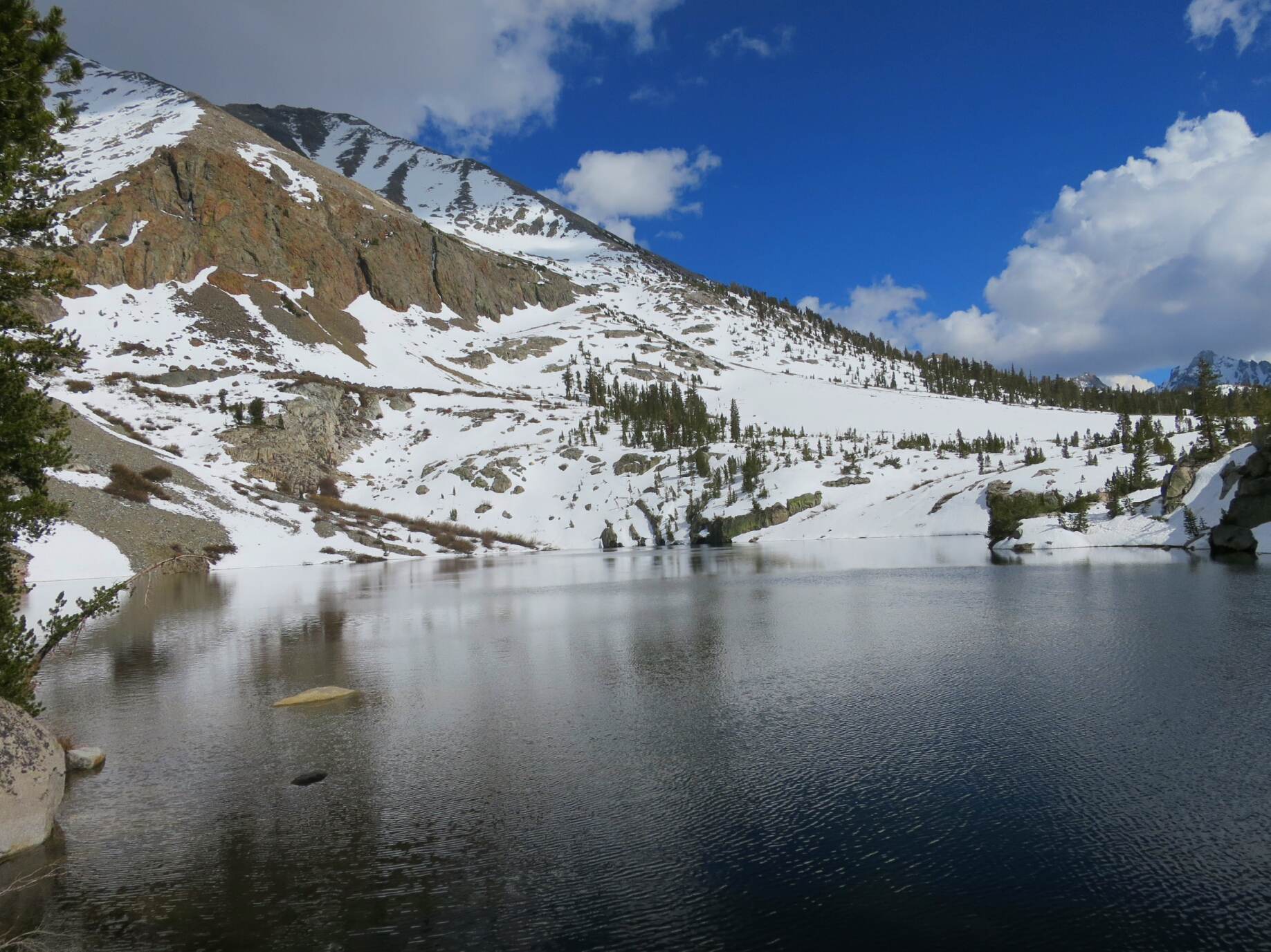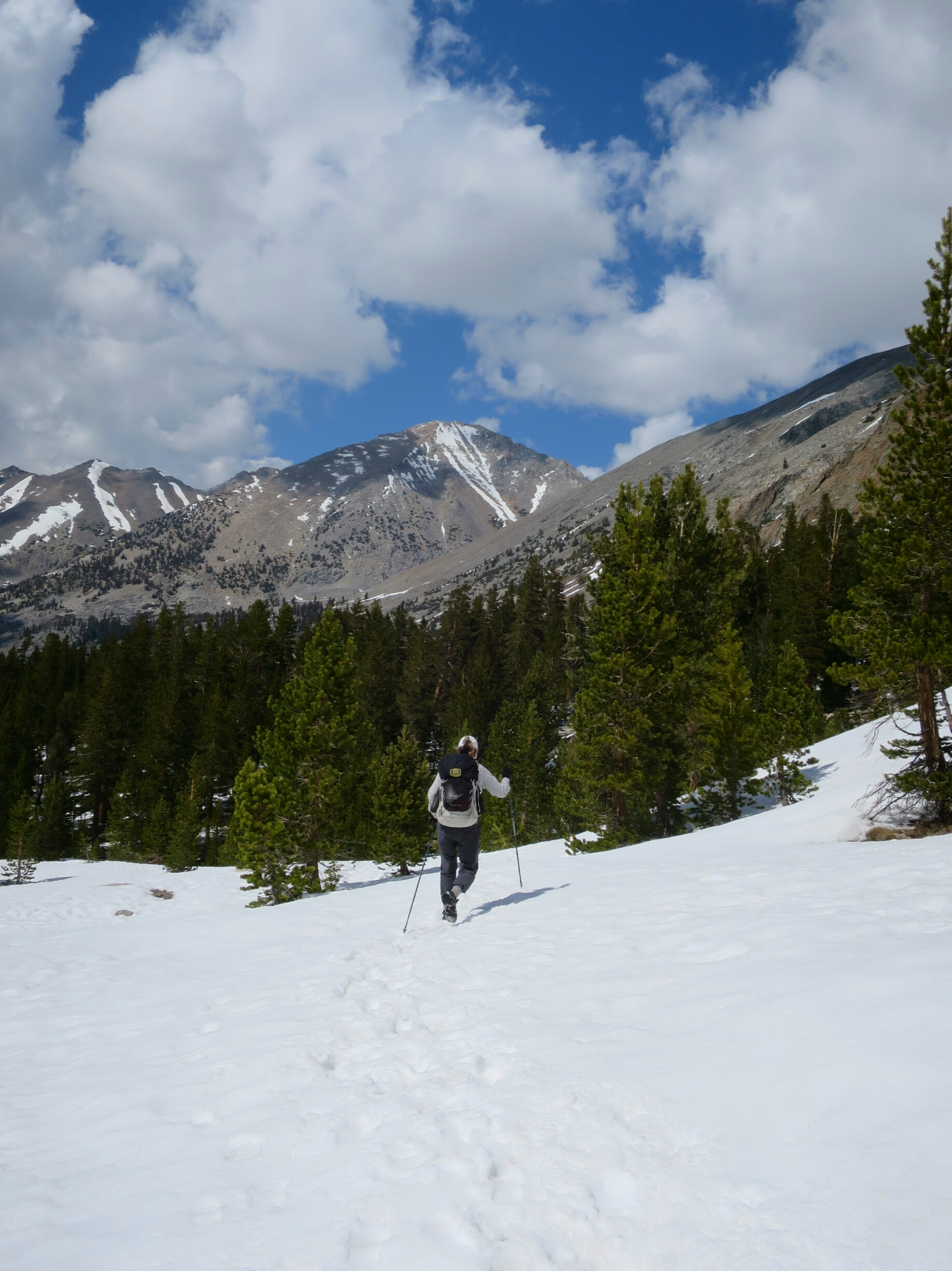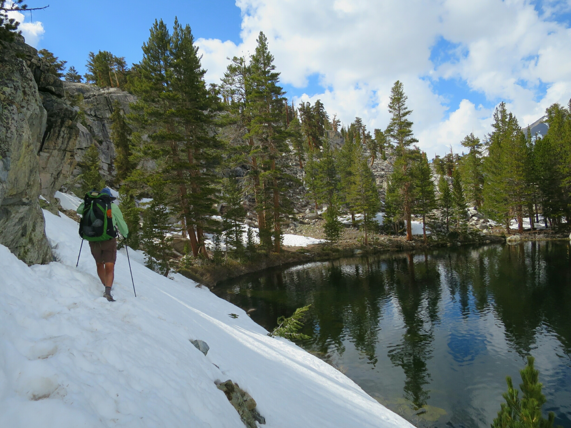 The rest of the day we weaved our way around several lakes, the last of which was not frozen. We thought we were snowfree and on the home stretch to our camp spot, but it turned out to be not so. Even along Dollar Lake, which was not frozen, we had to cut across a steep bank which was north facing and still covered in deep snow sloping down into the lake. Such a relief to get this over. The fear of sliding down into the water below was never far away. Just after crossing this patch of snow we saw a coyote on the other side of the lake. Amazing how how well it blended in with the landscape. It appeared to be hunting along the lake edge.