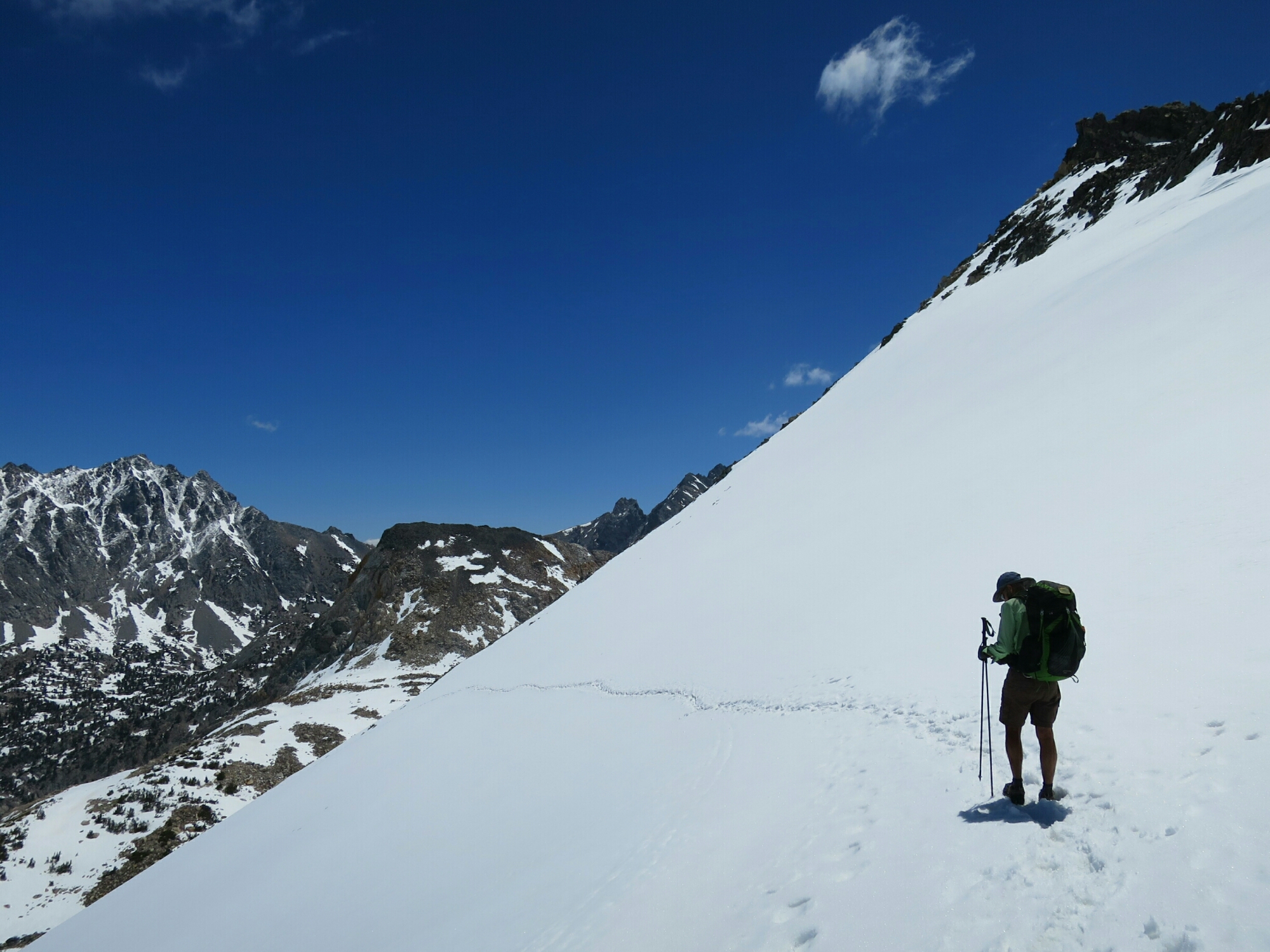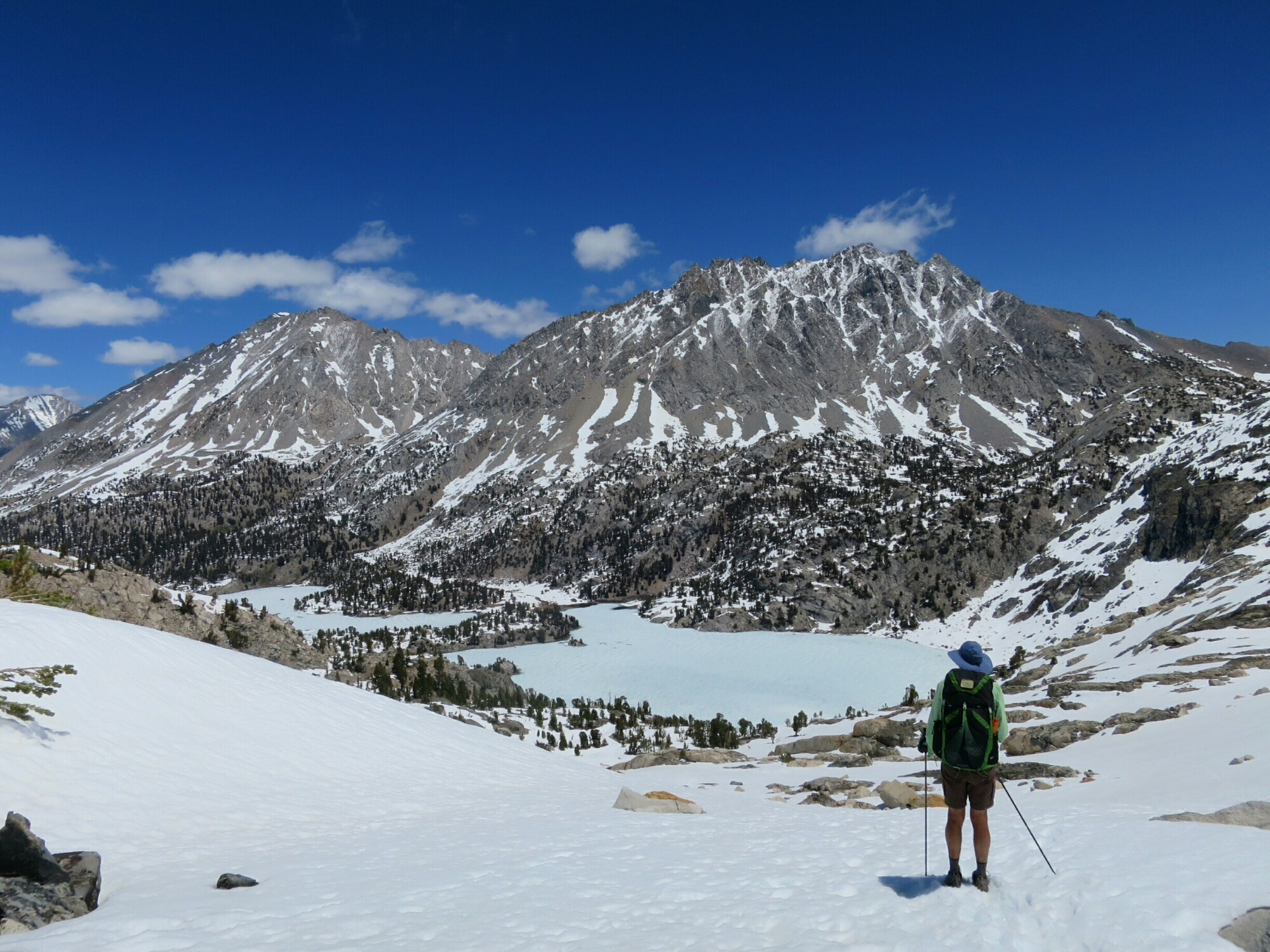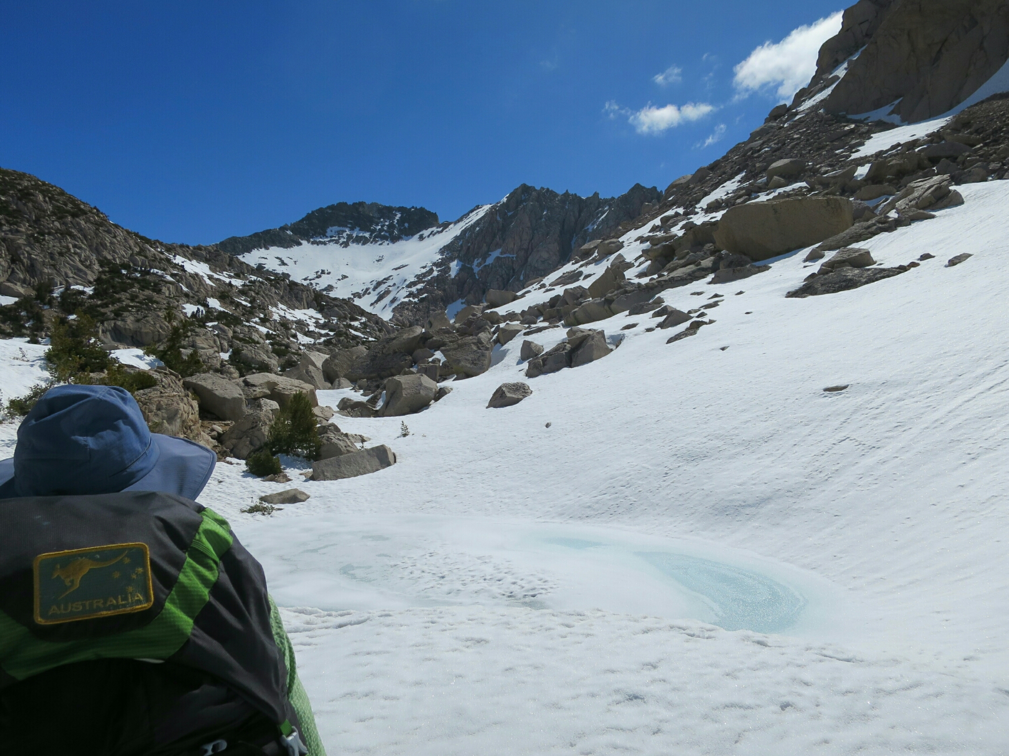 This morning we only had 4 miles to ascend Glen Pass which stands at 11, 947 feet. It took us almost 4 hours of sheer hard work. The trail up was icy and steep. Any switchbacks were covered in deep snow so it meant going straight up. Near the top required quite a bit of rock climbing over loose scree on a sheer slope. Not feeling very comfortable and trying not to look back down. Once on top the view north was stunning with frozen lakes forming chains down the valley.