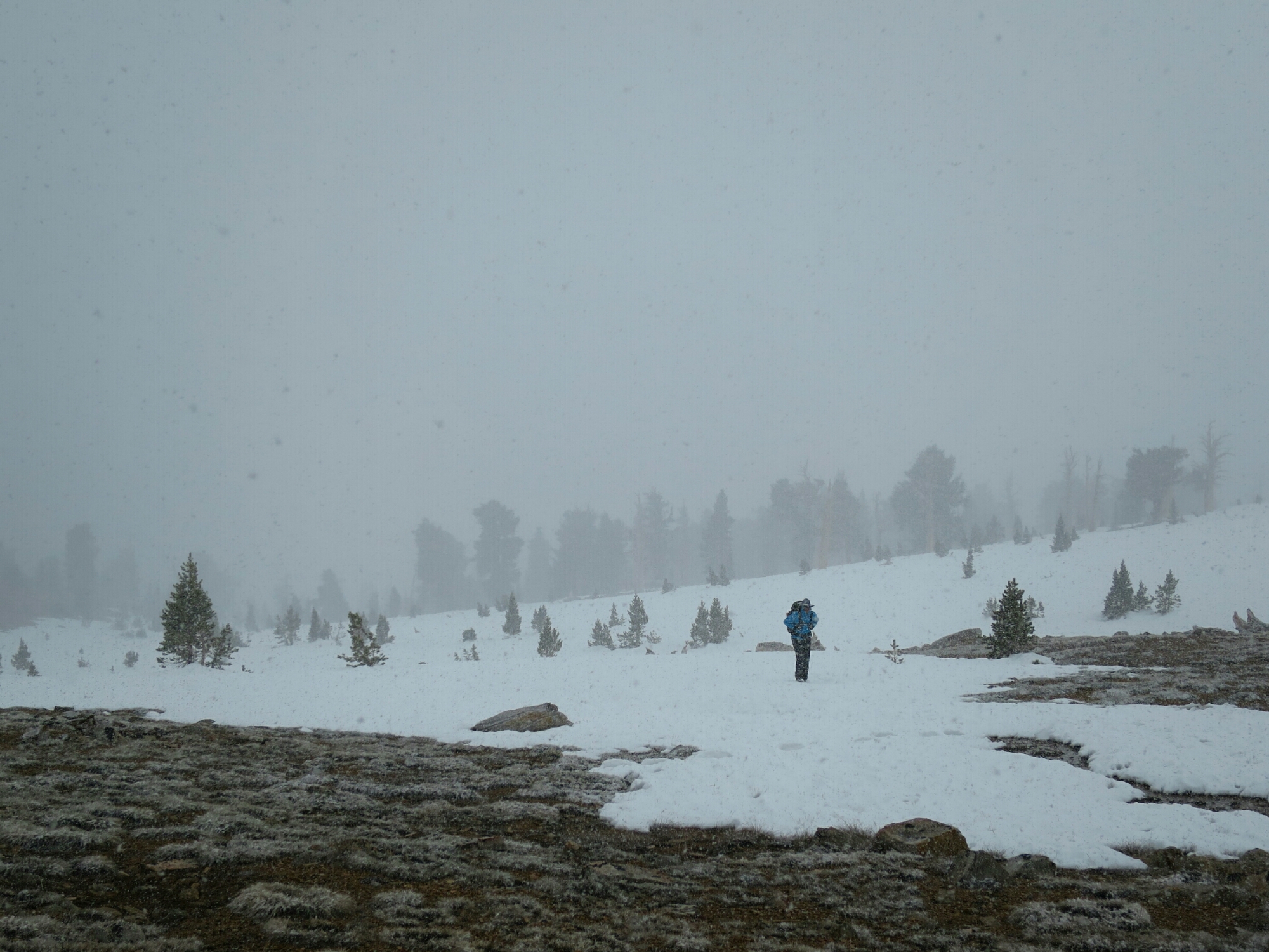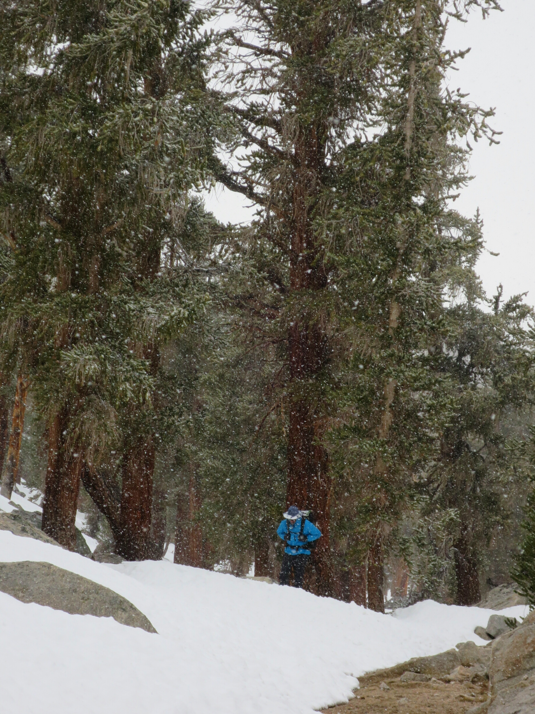 Relieved to get this over and done with we commenced the first of todays climbs. Up until now most of the climbs have been on a relatively gentle grade but not this one. We had to stop several times to catch our breath. Clouds were gathering and by the time we reached Crabtree Meadow and the junction with the Mt Whitney trail, a light snow had begun to fall. Luckily we had lunch by the time the snowfall increased.