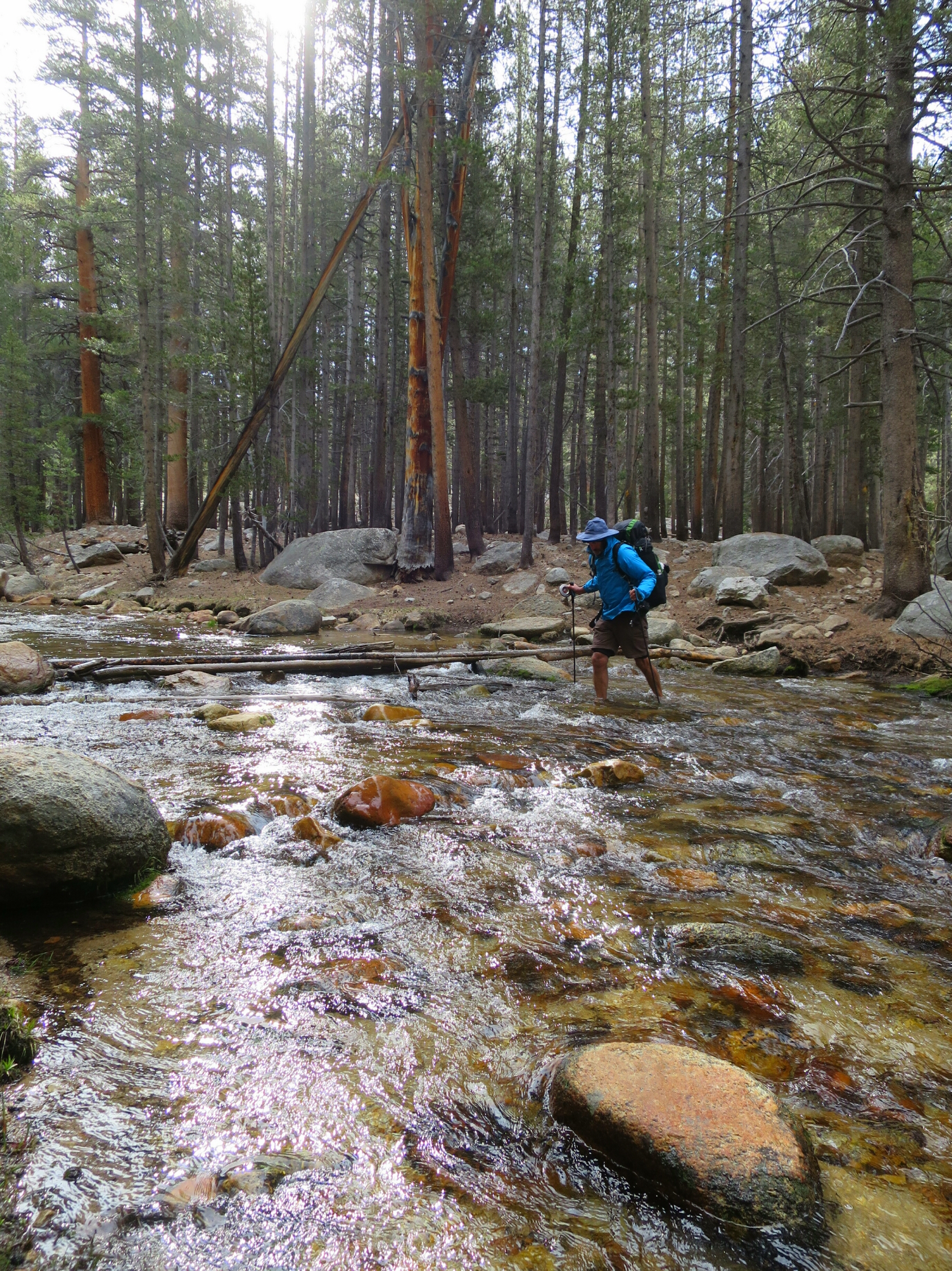 From our campspot we descended towards Rocky Creek in nice morning sunshine. My feet were still frozen and we were at our very first creek crossing. I was dreading the cold water so hurried taking my shoes off so I can get it over and done with. Not surprisingly, already cold feet go numb very quickly when immersed in snow melt water. Hammer thought it was cold but not unbearable. The rocky bottom was not slippery underfoot so made the crossing a bit easier.