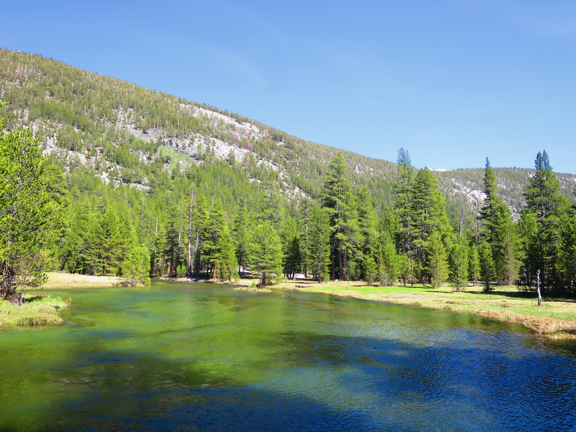 Once we descended to Lyell Canyon, the hiking was the best we’ve had for some time. It was almost too good to be true. We hiked through green meadows with the most amazing emerald green river meandering through. Gone was the mighty roar of snowmelt rushing off steep slopes. It was the type of hiking of the PCT I had always imagined. Hammer was tempted to go in for a swim, we’re it not for the enormous sized and numerous mosquitos which were feeding on his legs.