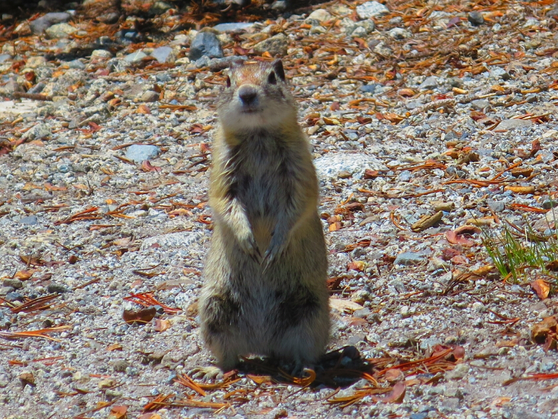 We stopped at the summit to enjoy the view back towards Mammoth. When we stopped we had the company of several cheeky marmots who kept aproaching us. Before too long we were joined by 6 southbound John Muir Trail hikers. This was to be the first of many we would see today. Before we reached Tuolumne Meadows we passed 35 southbound JMT hikers. We have not seen this many hikers in one day since leaving Campo. As we left the summit to beging the descent off the pass, one of the hikers gave us some friendly advice. He said to be very careful as the conditions were very difficult. We thanked him and wished the group happy trails.