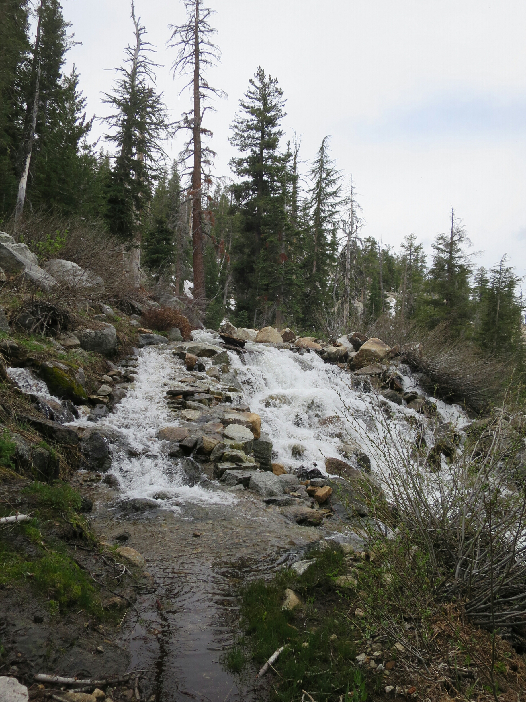Over the summit we started to descend to a canyon. On the way down we had another ‘reliable seasonal creek’ to cross. This also turned out to be a heart stopper as it was made of multiple braided streams barreling downhill and converging over the trail. It took us a while to work out the safest way to cross. We managed to get across with much trepidation.