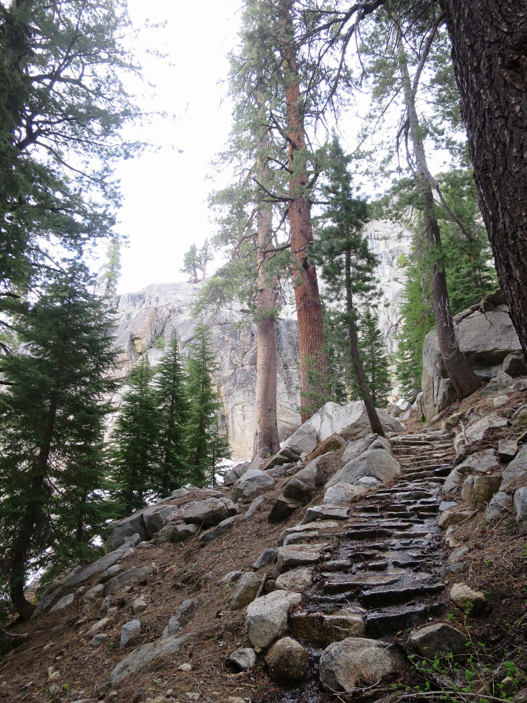 Nearly 2 hrs later we were on a recognizable trail at the bottom of the valley. We lost a lot of time and energy on the descent. On the way down Hammer broke a hiking pole. Less then 15 minutes later I slipped and took a chunk out of my left shin and broke my hiking pole. Yesterday when I fell in the river I bruised my right shin on the underwater boulder I could not get around.  A matching pair of bruised and bloodied shins and  2 broken hiking poles. We were only on day two out of Yosemite, the afternoon was not going well.
