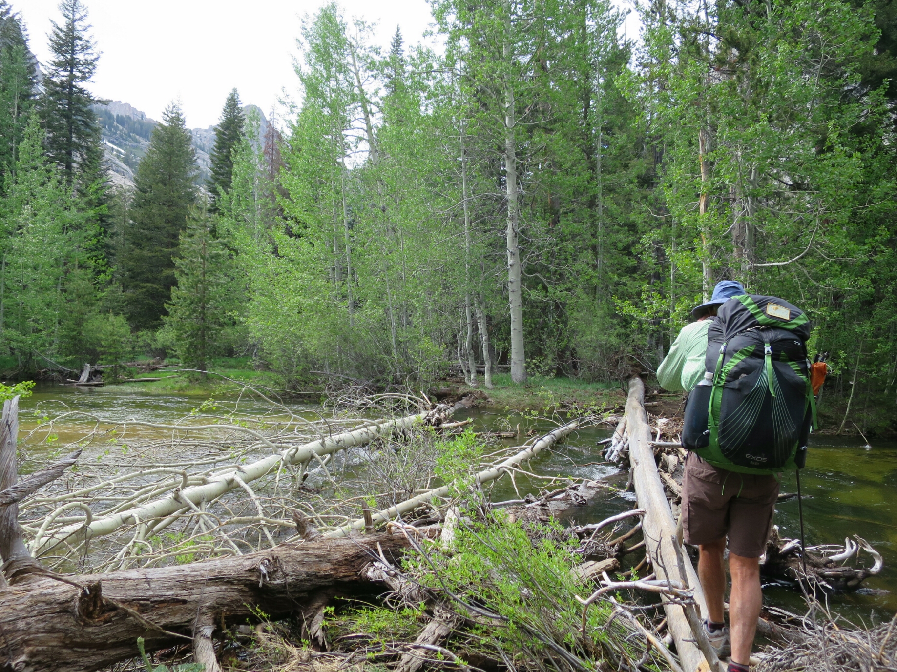 The sound of rushing water, when we woke up this morning, was an instant reminder that in less then 0.2 of a mile we had our first creek crossing of the day. My heart started to race almost immediately.  It took some time to calm myself down and just wait and see what it’s like when we get there.  Matterhorn Creek was listed as being a large and wide creek. It was a very chilly morning and it would be a while before the sun penetrated down into the valley.