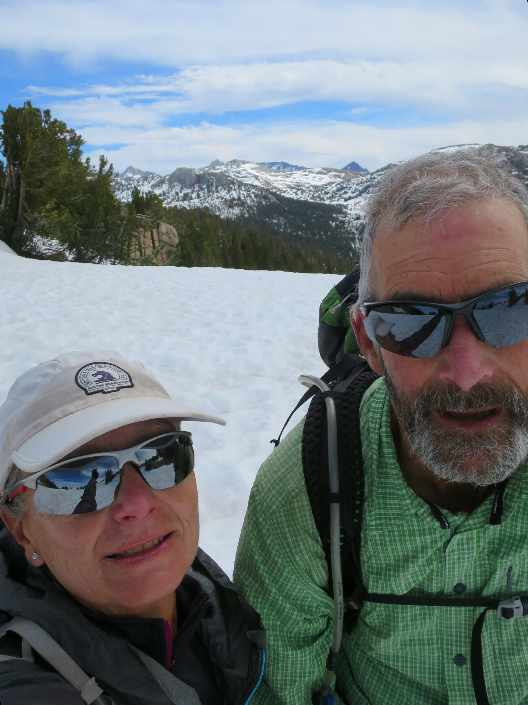 This turned out to the the easy part. The descent was not so easy. Unlike the other passes we traversed in the High Sierra mountains, Benson Pass is unforgiving if you go off trail which we did almost immediately.  Hammer started to descend steeply only to pull up on top of an escarpment near a huge waterfall.  We thought we could cut across to get back on trail only to be trapped underneath a huge vertical wall of rocks.  Much hard slogging uphill through snow and over boulders before we were finally back on the trail.