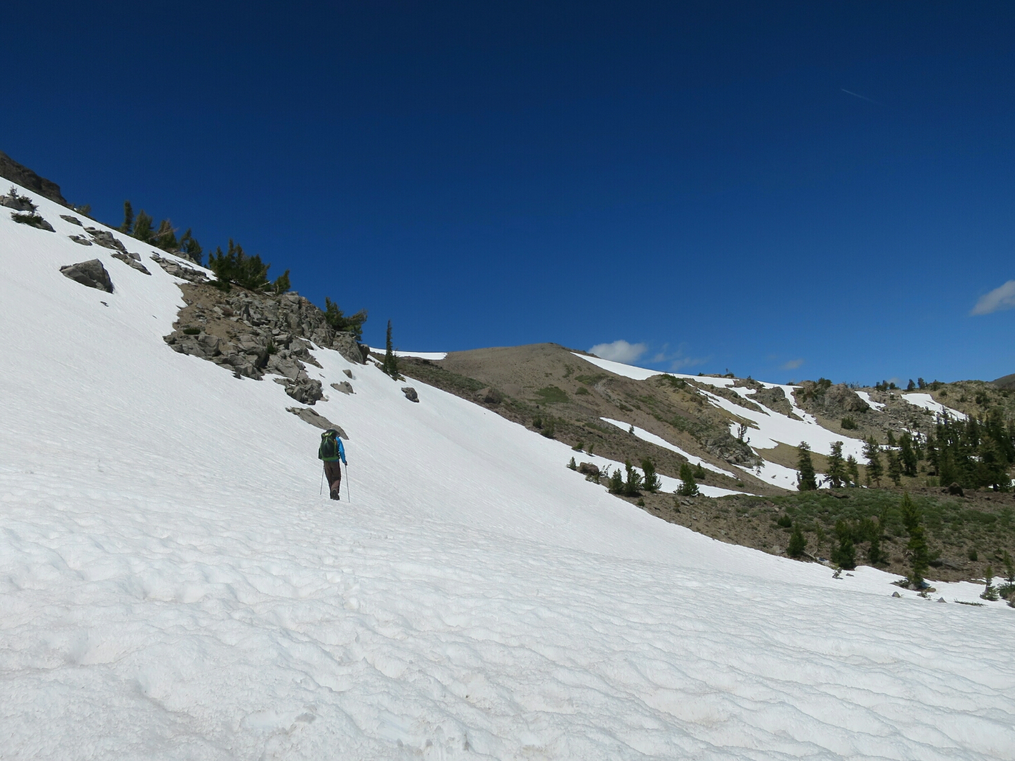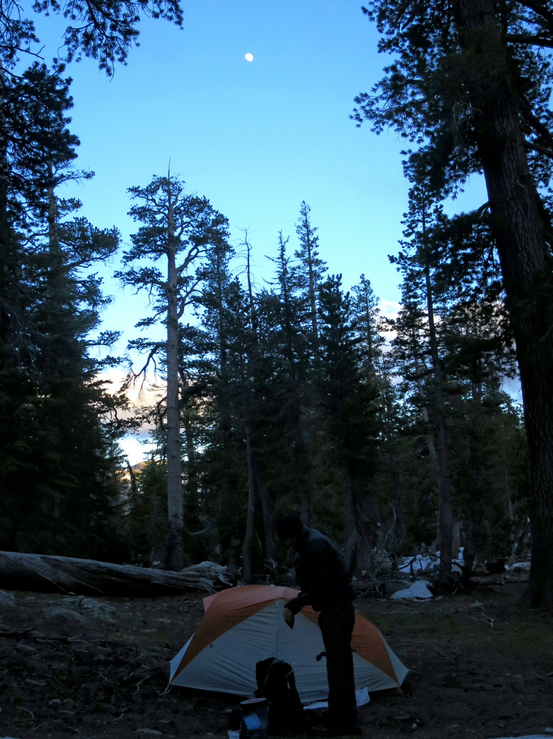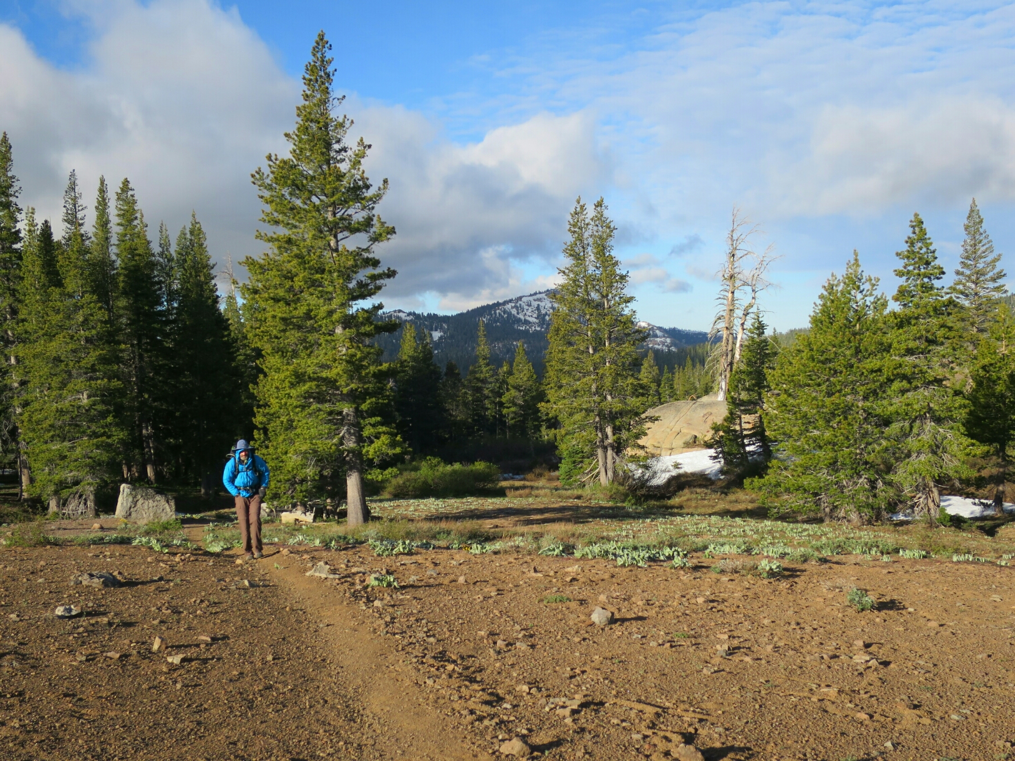 A mile or two outside of Carson Pass we started to encounter snow and we stayed in snow for the rest of the day. We were led astray twice by footprints which went off trail. A lot of wasted time, energy and daylight. We could not get out of the deep snow and forest before dark so we had to make camp in a clear bit of ground we found. Today has been by far the coldest day hiking on the PCT. And that wind was something else.
